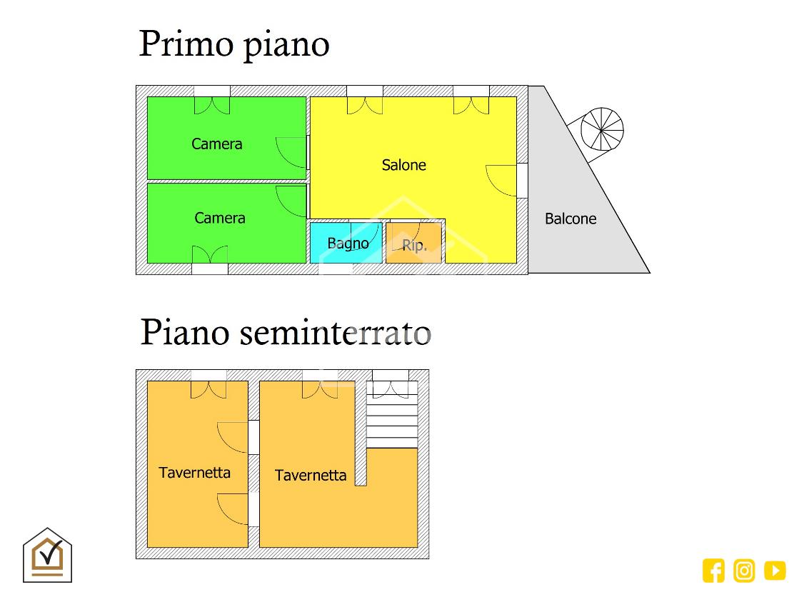 L'abitazione è così composta: dal piano terra si ha accesso ad un ampio open space, provvisto di servizi e ripostiglio, e dal piano seminterrato in cui si trova una comoda tavernetta personalizzabile. Le scale a chiocciola esterne, invece, conducono al primo piano composto da un luminoso salone, due stanze da letto, bagno e ripostiglio.