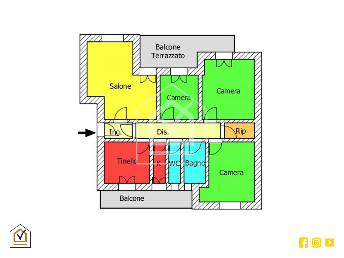 L'immobile si presenta con una planimetria uniformemente suddivisa in quanto la zona giorno con salone, cucina e cucinino sono posti all'ingresso mentre la zona notte compasta da tre camere da letto due bagni ed il ripostiglio e posta nella zona retrostante. Tale suddivisione rende l'immobile ideale per coloro che non volessero avere la zona notte a vista.