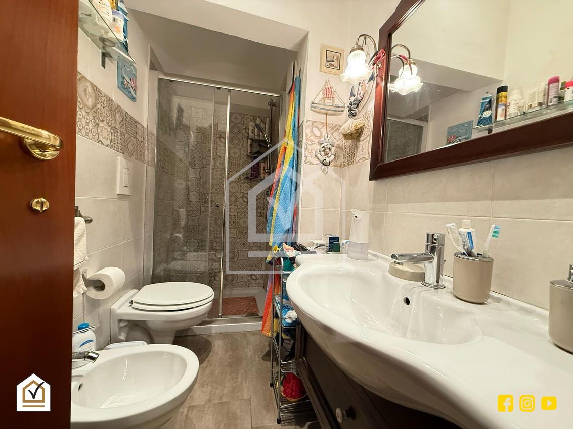 Dal soggiorno si accede direttamente ad un moderno bagno con box doccia in cristallo e sanitari sospesi, un angolo ben curato dove ogni dettaglio è stato pensato per garantire comfort e stile. Proseguendo nel open space, troviamo la spaziosa camera da letto matrimoniale, che gode di una piacevole luce naturale grazie alla finestra che si affaccia sull'atrio esterno, offrendo privacy e tranquillità.