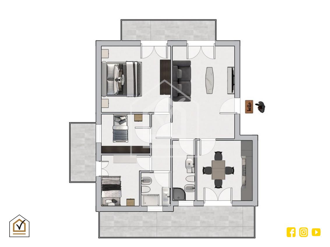 L’appartamento si compone di un ampio salone che rappresenta il cuore della casa, perfetto per momenti di relax e convivialità. La cucina separata è spaziosa e funzionale, con la possibilità di ospitare un tavolo per pranzi e cene in famiglia. La zona notte è composta da due camere da letto di generose dimensioni, entrambe molto luminose e accoglienti. Un studio aggiuntivo, facilmente adattabile a seconda delle proprie esigenze, offre la possibilità di creare un angolo di lavoro o una stanza per gli ospiti.