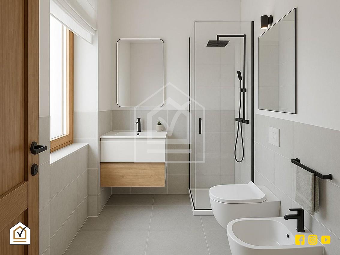 - Bagno con sanitari a pavimento, box doccia e lavabo a colonna;