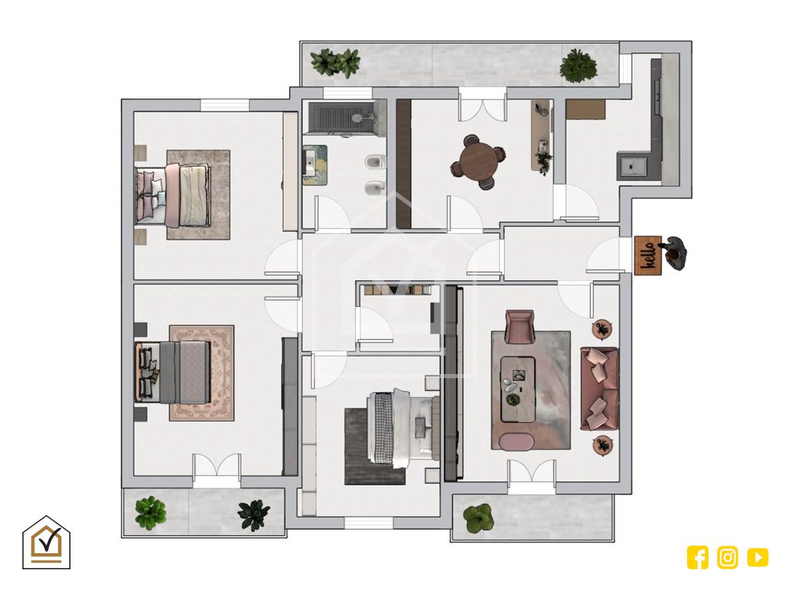 L’ingresso si apre direttamente sulla zona giorno, composta da un luminoso salone con affaccio su balcone e da una comoda sala da pranzo, completa di cucinino verandato. Proseguendo nel disimpegno, si accede alla zona notte dove troviamo un ampio bagno finestrato con box doccia, tre grandi camere da letto tutte con accesso a balconi, e un utile ripostiglio.