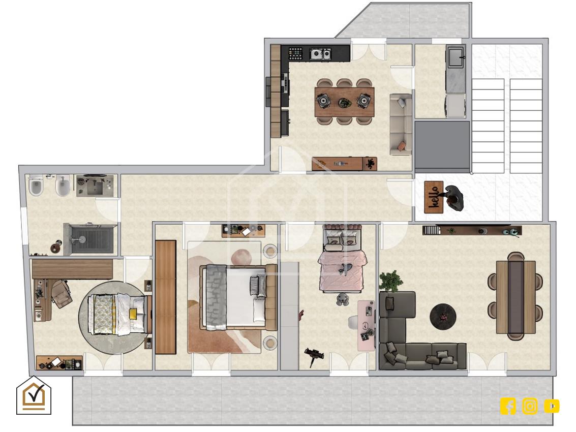 L’ingresso si apre su un comodo disimpegno che accompagna verso la zona giorno, dove troviamo una cucina abitabile, spaziosa e ben organizzata, dotata di zona lavanderia e accesso diretto a uno dei balconi. Adiacente alla cucina, un ampio e luminoso soggiorno offre uno spazio ideale per accogliere amici e familiari, anch’esso servito da un secondo balcone che garantisce ulteriore luminosità e un piacevole affaccio.