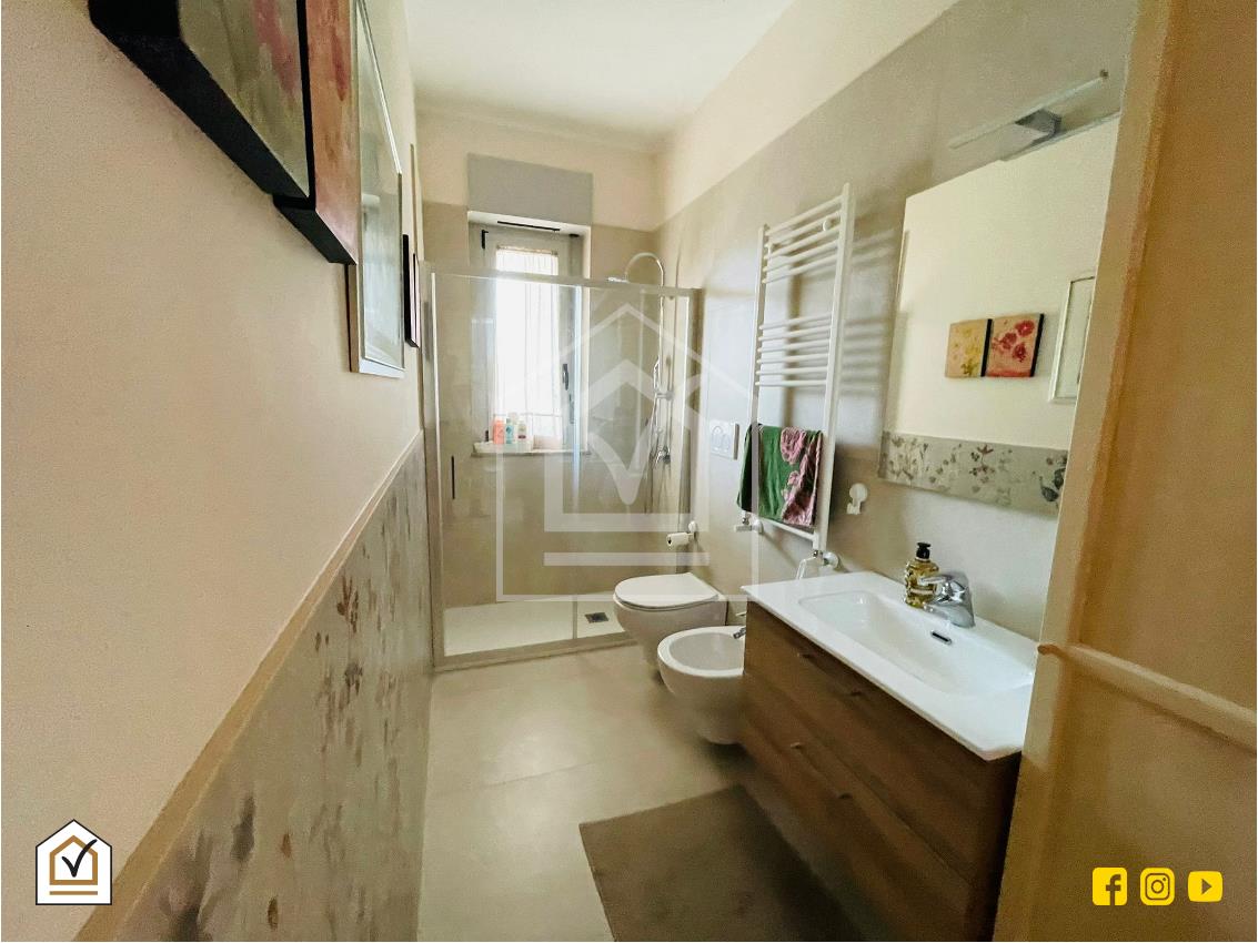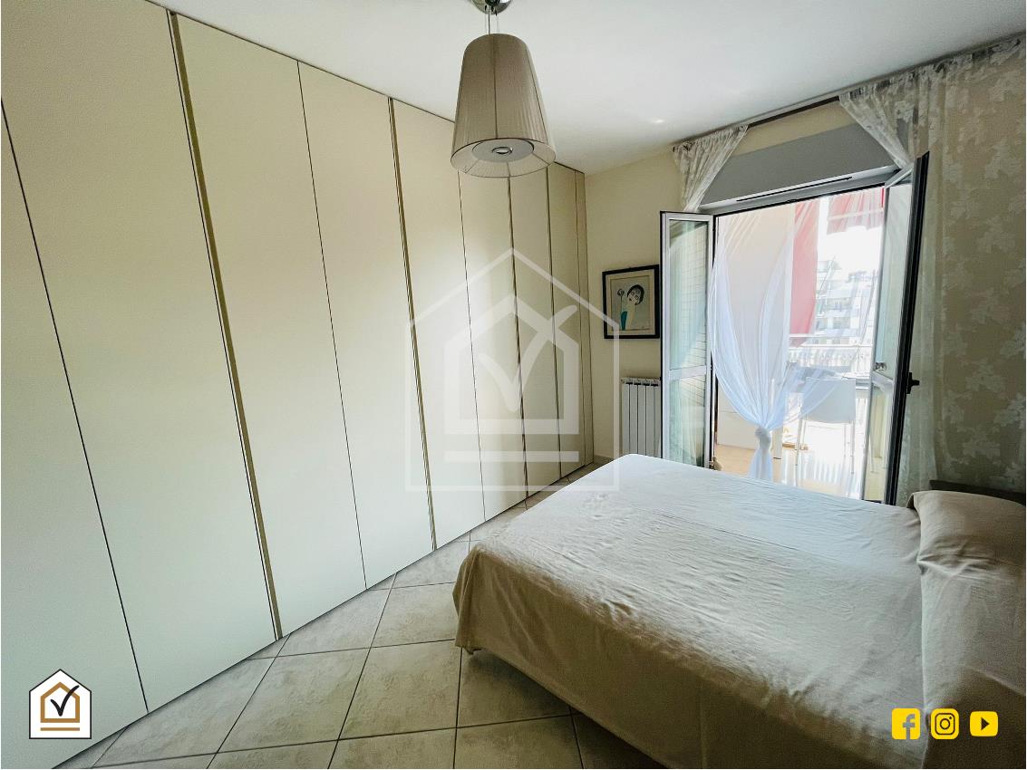 La camera da letto matrimoniale è ampia e luminosa, dotata di armadiature a muro su misura e accesso diretto al balcone. Il bagno è moderno, con doccia walk-in, sanitari sospesi e rivestimenti eleganti.