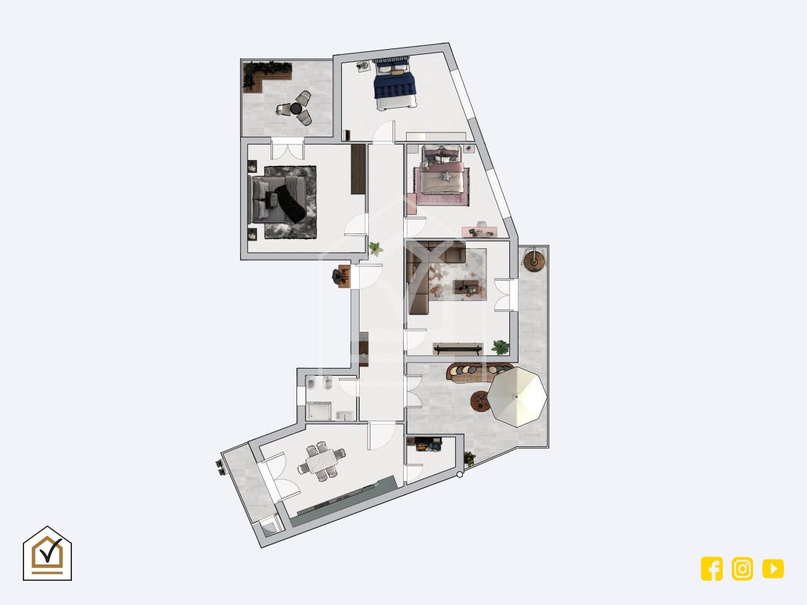 L'appartamento si distingue per l’ampia metratura, circa 135 mq., ma soprattutto per la luminosità naturale data dall'altezza e dagli infissi fuori misura presenti nell'immobile e dagli ampi terrazzi a livello che permettono di pranzare o cenare all'aria aperta nelle sere d'estate con amici o parenti.