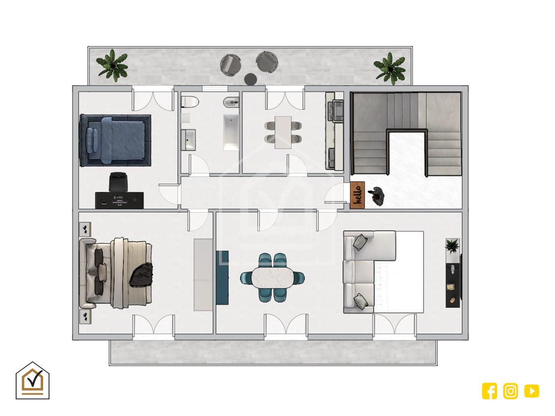 Varcando la porta d'ingresso troviamo un disimpegno che conduce al cuore della casa: un salone doppio di oltre 30 mq, ampio e luminoso, con doppio affaccio sul balcone che regala una piacevole sensazione di continuità tra interno ed esterno. La cucina, separata e abitabile, dispone anch’essa di uscita sul balcone, rendendo gli ambienti estremamente funzionali. La zona notte è composta da una camera matrimoniale e da una cameretta, entrambe con accesso ai relativi balconi, e da un bagno padronale finestrato. Ogni stanza della casa gode di affaccio esterno, una caratteristica rara che assicura ariosità e luce in ogni momento della giornata.