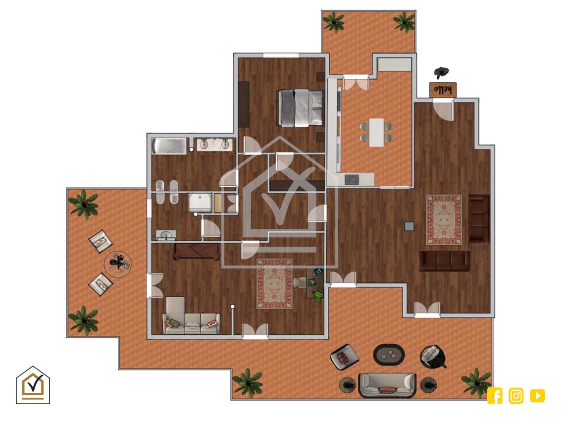 L’ingresso si apre su un ampio salone doppio, luminoso e arioso, impreziosito da grandi aperture che conducono a un balcone terrazzato attrezzato, vero protagonista della casa. Qui è possibile creare una zona relax o un angolo conviviale per pranzi e serate all’aperto, godendo della vivacità del corso.