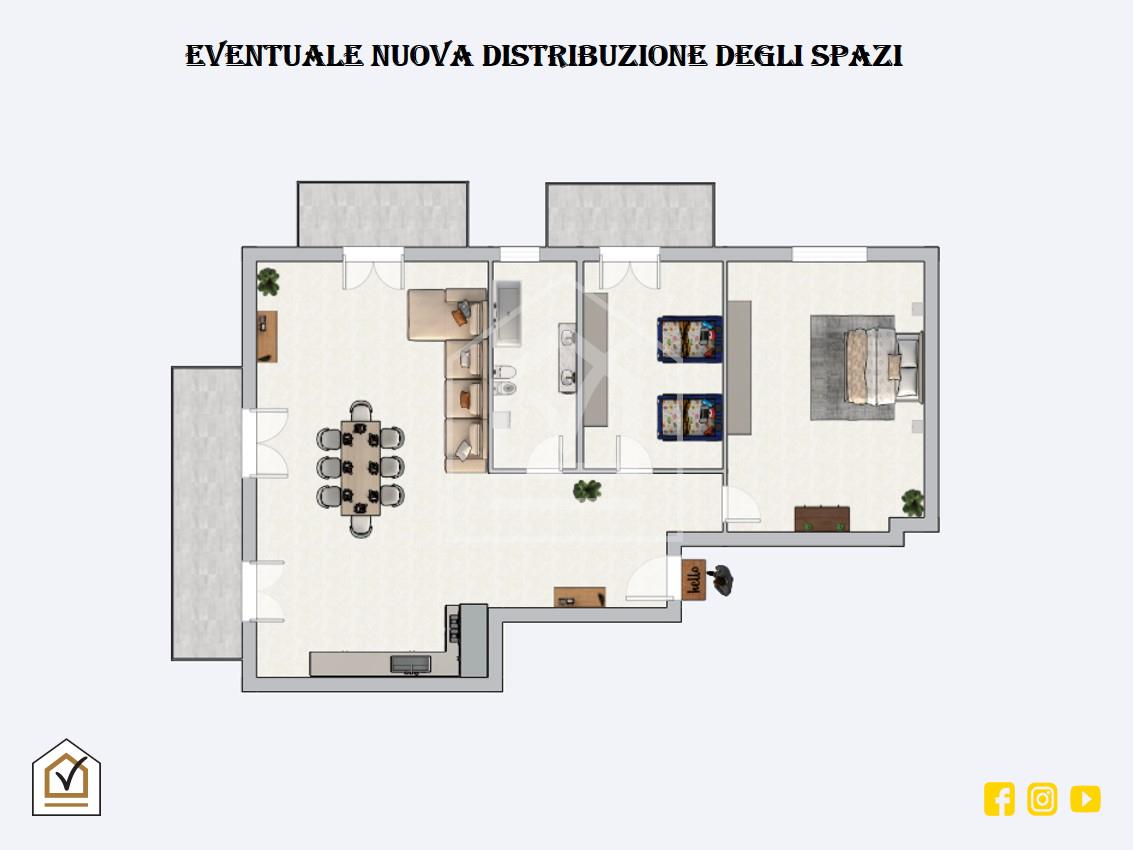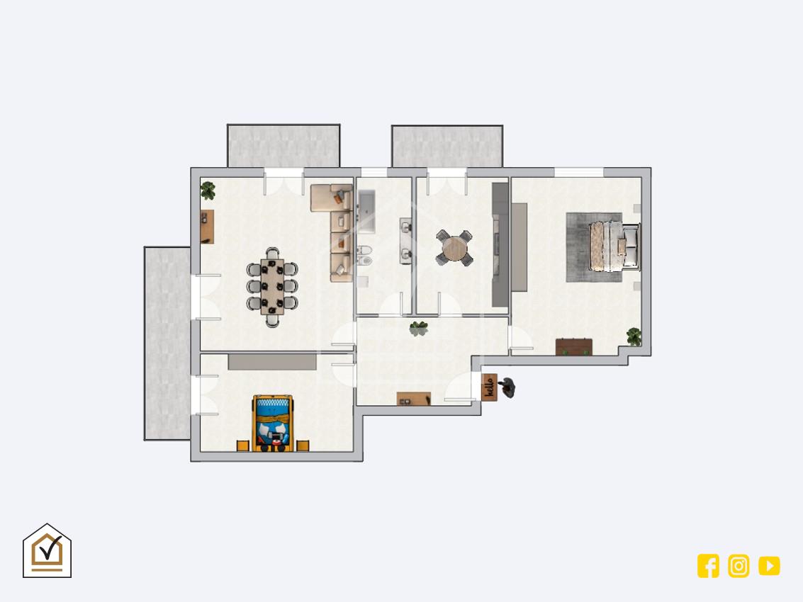 Si sviluppa su una superficie interna di 85 mq ca. e si compone di ampia zona giorno con salone, due camere da letto e bagno. Data la sua pianta regolare è possibile apportare delle modifiche cosi da ricreare una ambiente unico moderno e funzionale avendo sempre a disposizione le due camere da letto.