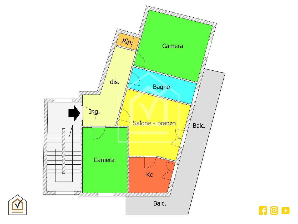 Si tratta di un'abitazione di 90 mq circa composta da: ingresso che conduce alla zona giorno con salone - pranzo, cucinino e accesso all'ampio balcone con esposizione angolare; dallo stesso disimpegno è possibile accedere alla prima camera (adibita attualmente a studio),  alla camera matrimoniale, al bagno finestrato munito di vasca e all'utile ripostiglio.
