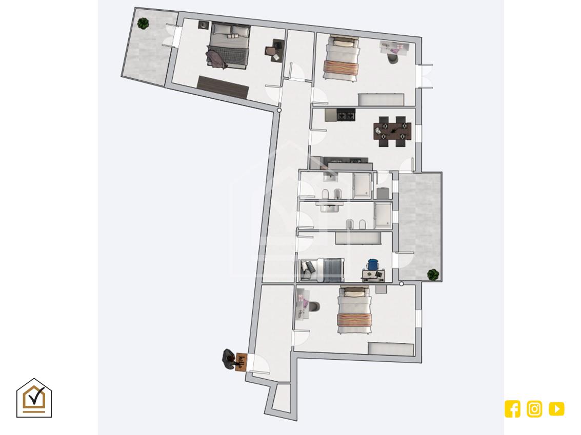 All’ingresso si trova un comodo ripostiglio, seguito da un lungo corridoio che distribuisce gli ambienti principali. Sulla destra si trovano le prime due camere da letto: la prima con finestra e la seconda con accesso a un balcone. Proseguendo si trovano i due bagni e il vano lavanderia, e la cucina abitabile insieme alla terza camera da letto con finestra. In fondo al corridoio troviamo un ripostiglio centrale, con la quarta camera da letto a sinistra, anch’essa dotata di balcone.