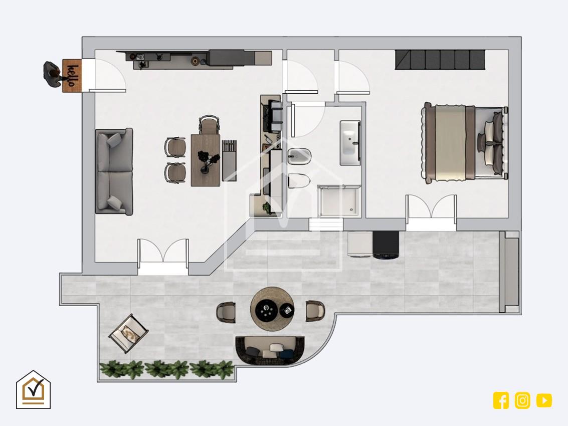 L’ingresso conduce direttamente in una luminosa zona giorno open space, con cucina a vista funzionale e ben integrata nell’ambiente. La zona notte comprende una spaziosa camera da letto matrimoniale e un bagno completo con finiture moderne. Tutti gli ambienti godono di eccellente luminosità naturale e si affacciano su un ampio balcone, ideale per momenti di relax all’aperto.