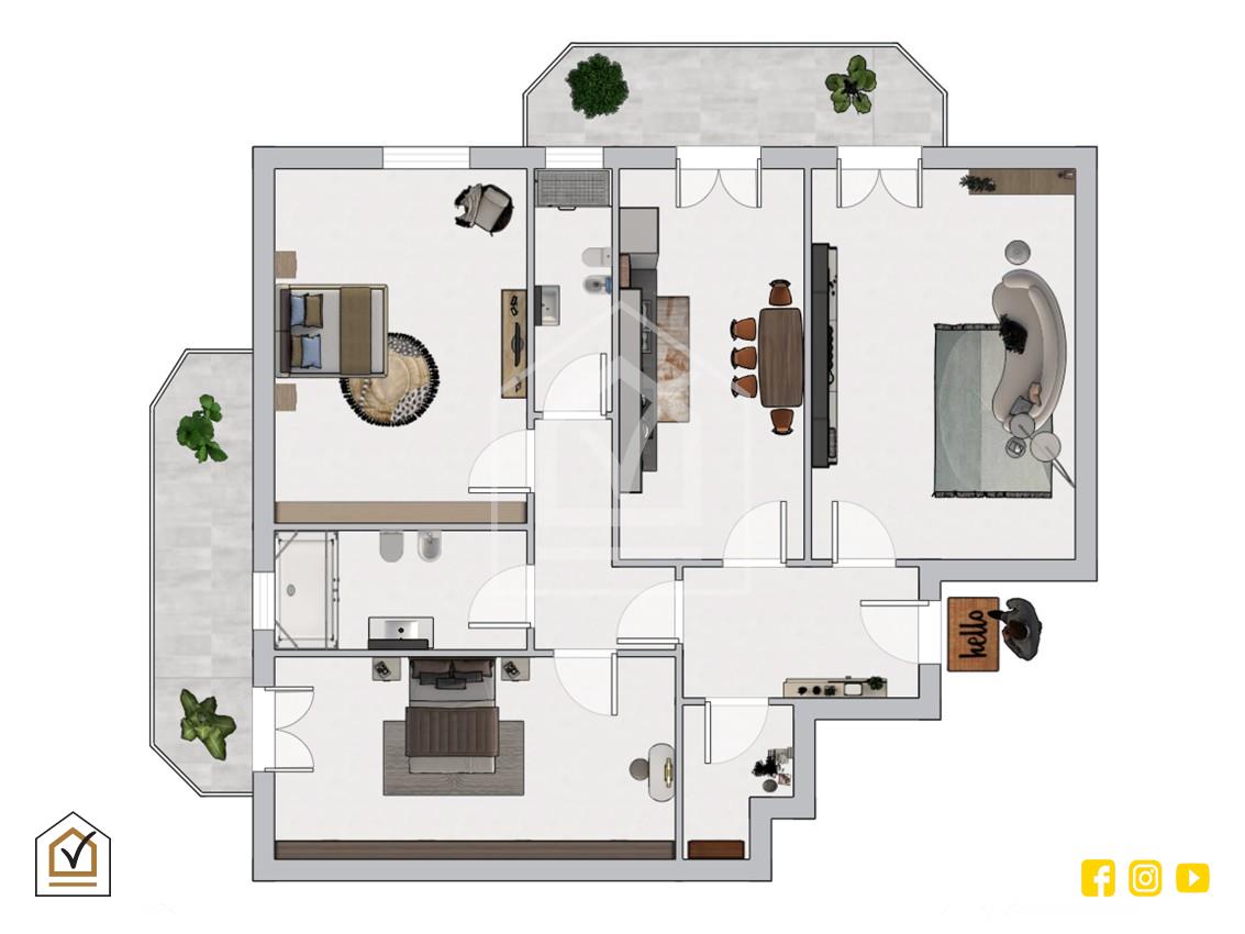 La zona notte, ben disimpegnata, ospita due camere da letto spaziose: una dotata di balcone, ideale per momenti di relax all’aperto, l’altra con la possibilità di realizzare un bagno en suite, garantendo così un comfort aggiuntivo e una maggiore privacy.