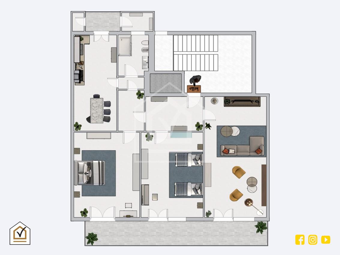 La doppia esposizione garantisce luce naturale durante tutto il giorno, mentre i balconi offrono gradevoli affacci sia interni che esterni.