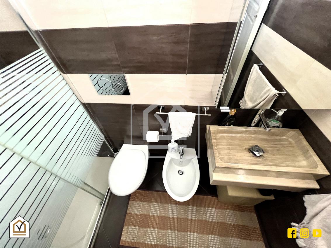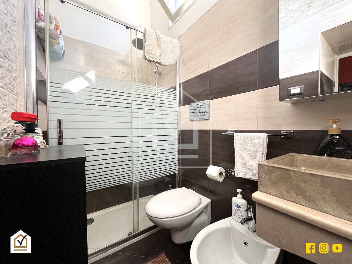 L’abitazione si apre su un ingresso luminoso con accesso al bagno con box doccia.