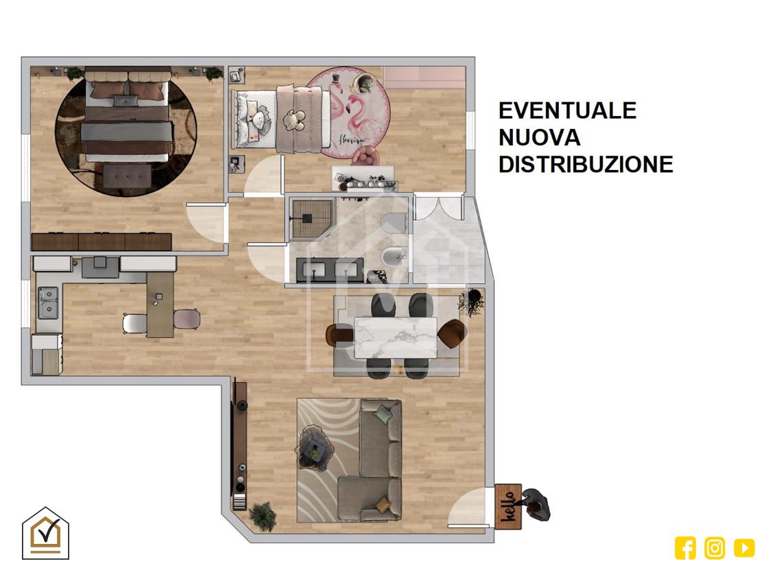 L’ingresso si apre su un comodo disimpegno che introduce alla zona giorno, dove troviamo un luminoso soggiorno e una cucina abitabile con accesso diretto al balcone interno, perfetto per stendere o per creare un angolo verde riservato. La zona notte è composta da due camere da letto di buone dimensioni e da un bagno patronale finestrato, funzionale e completo.