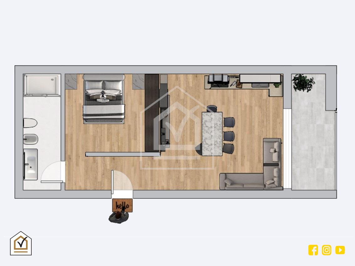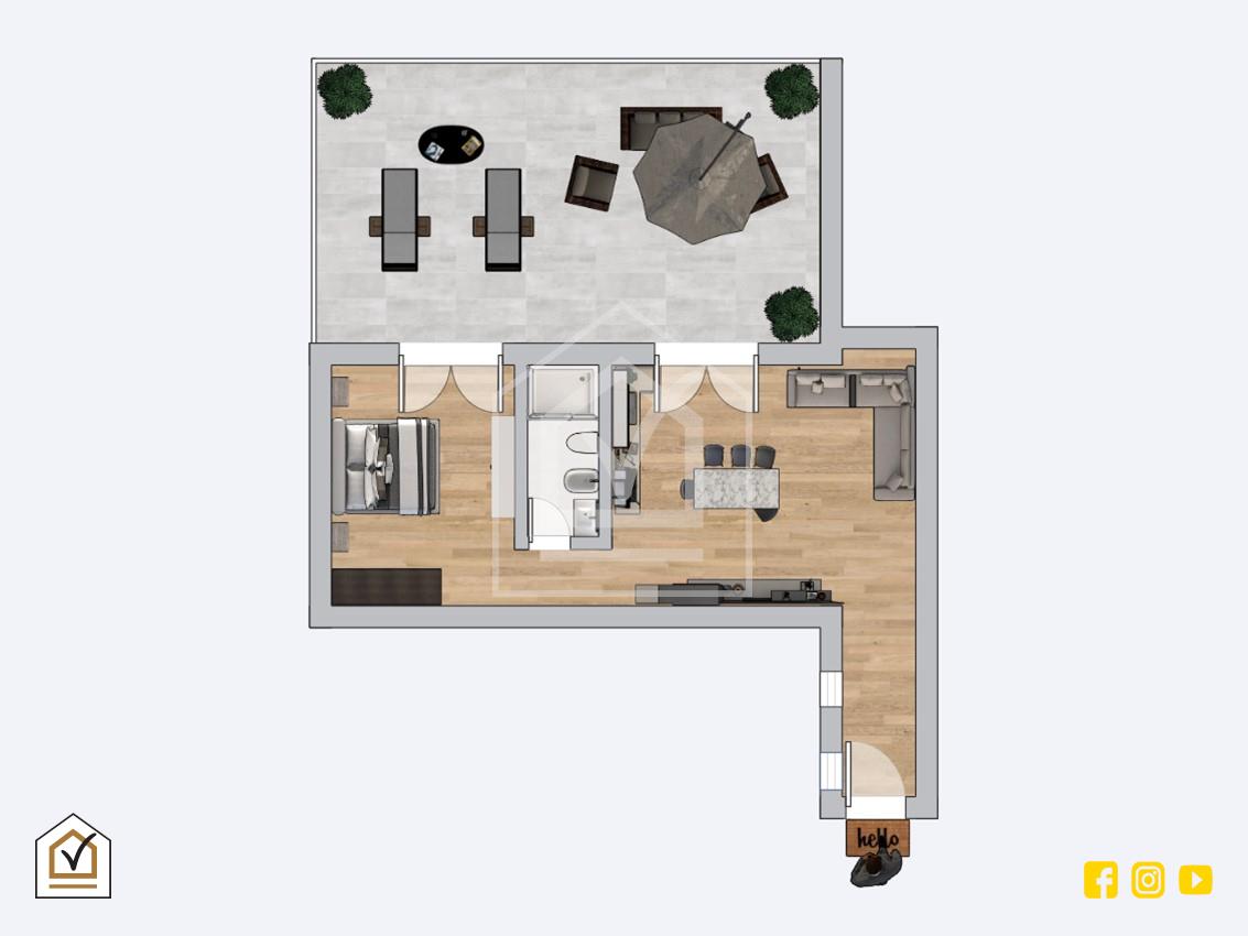 • Pavimentazione in gres porcellanato effetto legno;