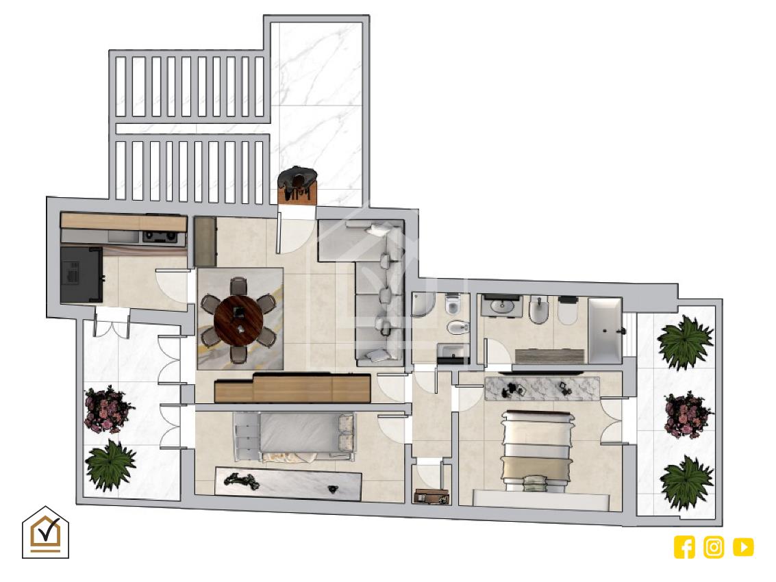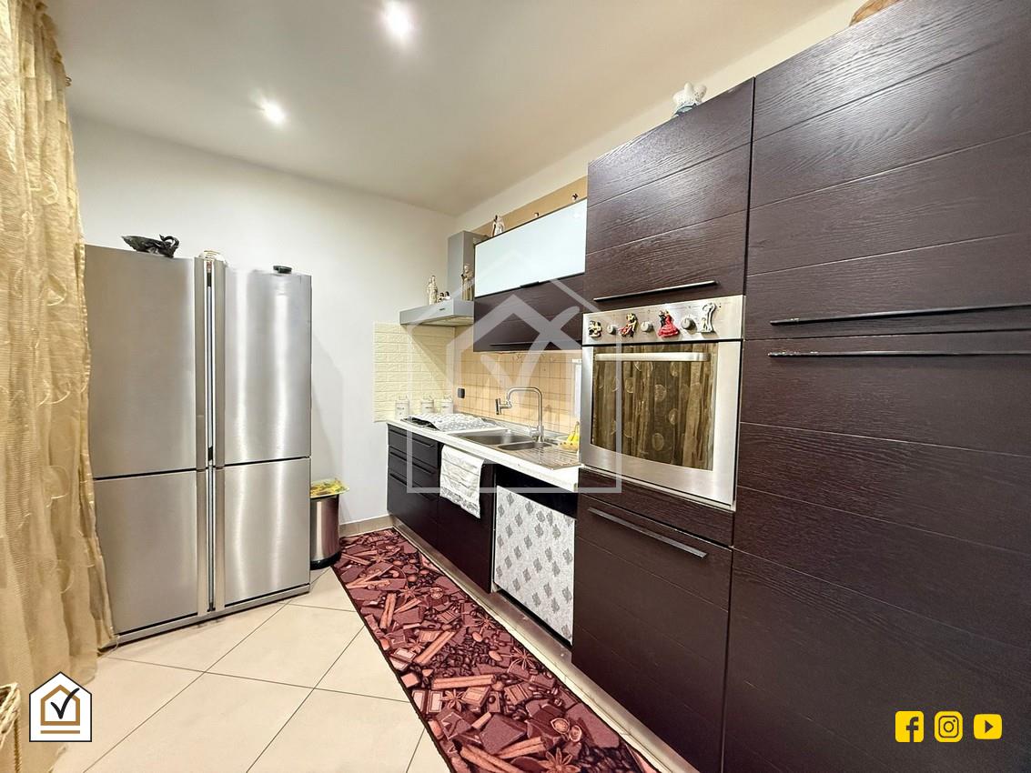 All'ingresso, troviamo un ampio soggiorno che affaccia su uno dei due balconi terrazzati, per un totale di 15mq di spazi esterni, ideali per momenti di relax all'aria aperta. Il soggiorno è ben separato dalla cucina abitabile, che, pur avendo una portafinestra che la rende particolarmente luminosa, non ha accesso diretto al balcone.