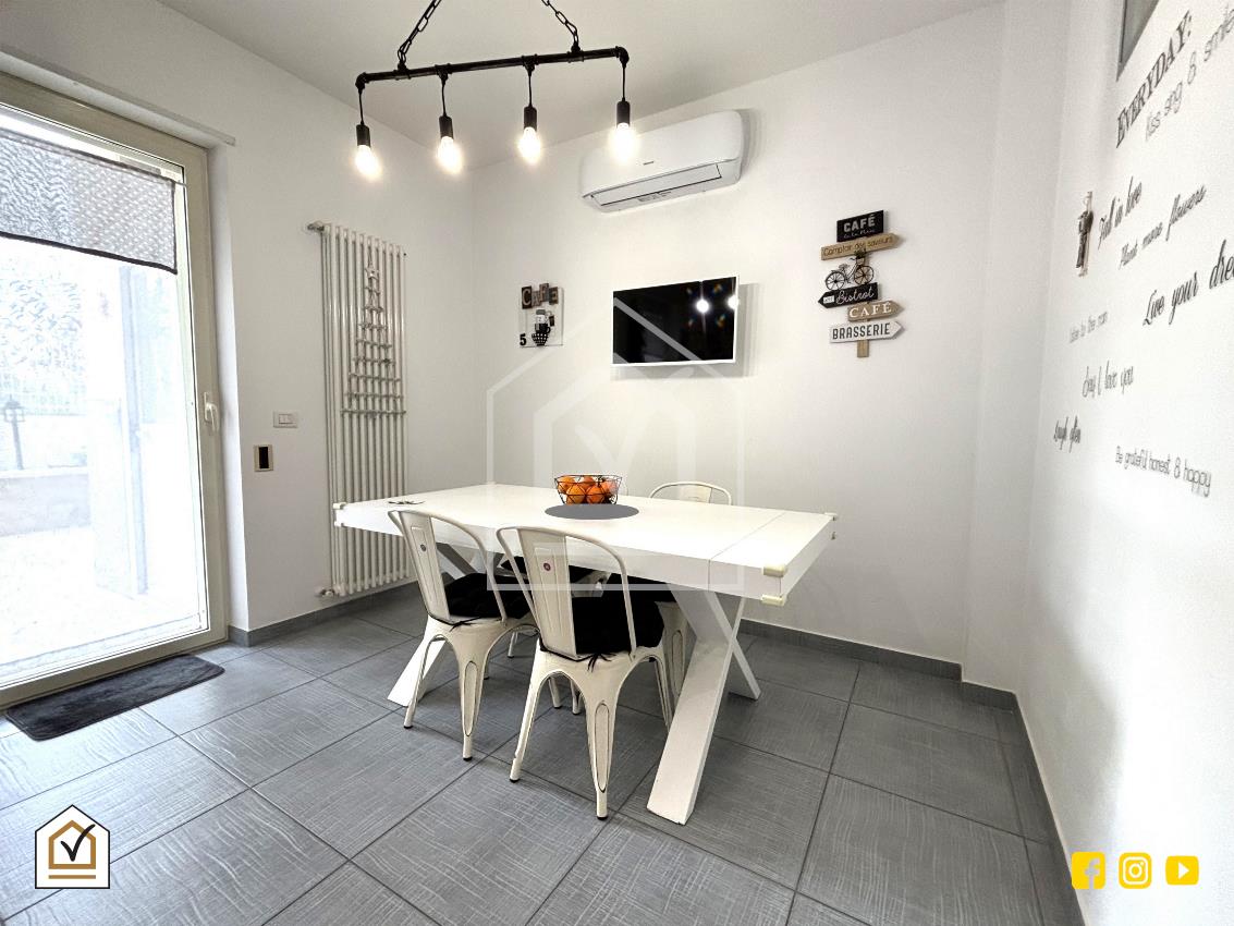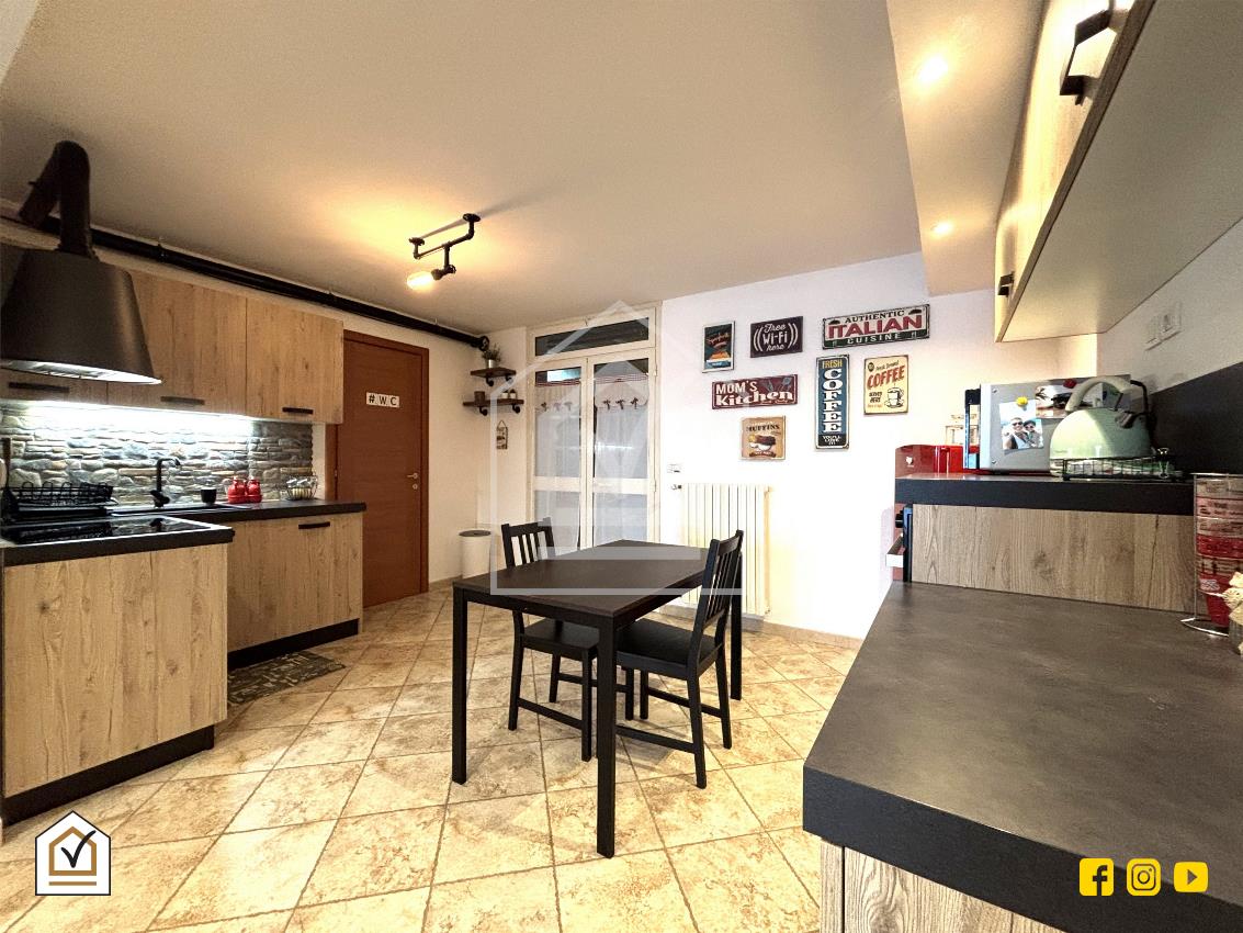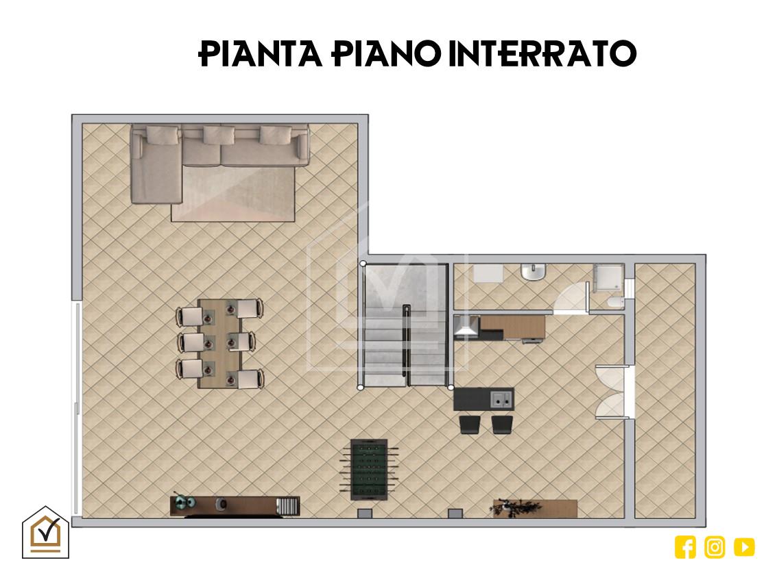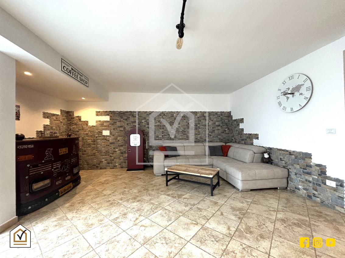 La tavernetta rappresenta un vero valore aggiunto: vi si accede sia dall’interno sia tramite ingresso indipendente con doppia vetrata scorrevole in PVC, che la rende luminosa e perfetta anche come spazio per ospiti o come ambiente ricreativo. La pavimentazione in gres effetto pietra e la controsoffittatura con faretti a LED creano un ambiente caldo e accogliente, completo di angolo cottura, area living e bagno.