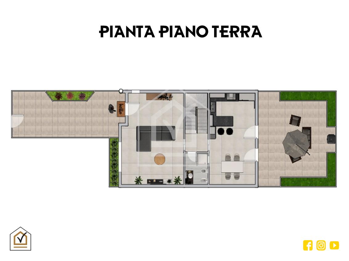 Varcato il cancello, un viale pavimentato adornato da fioriere conduce direttamente al piano terra dove si sviluppa la zona giorno: Il salone, raffinato e contemporaneo, è impreziosito da una pavimentazione in grès che dona eleganza e continuità agli ambienti. La cucina abitabile, completa di penisola è caratterizzata da una controsoffittatura con faretti a LED e un rivestimento in grès effetto maioliche. Da qui si accede al cortile interno, un angolo di quiete perfetto per vivere l’esterno in totale privacy. Completa il piano il bagno completo di box doccia, anch’esso rivestito in gres effetto maioliche.