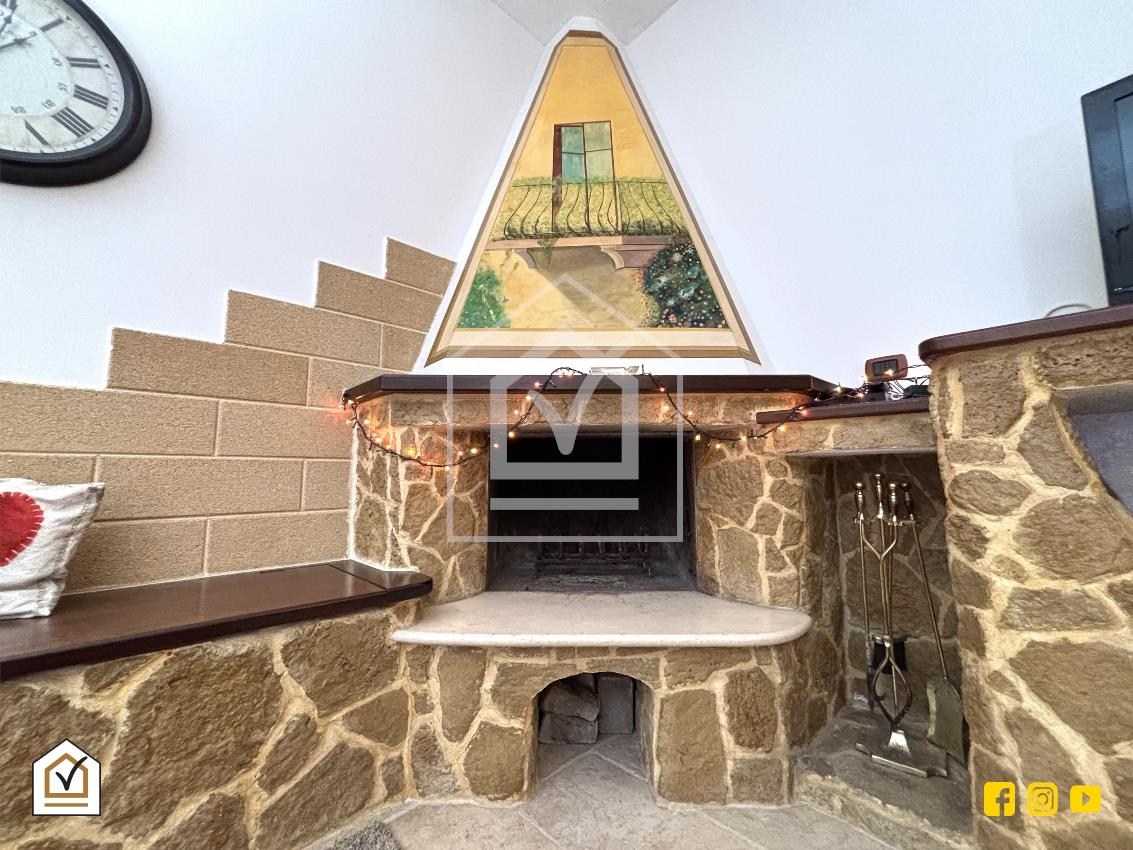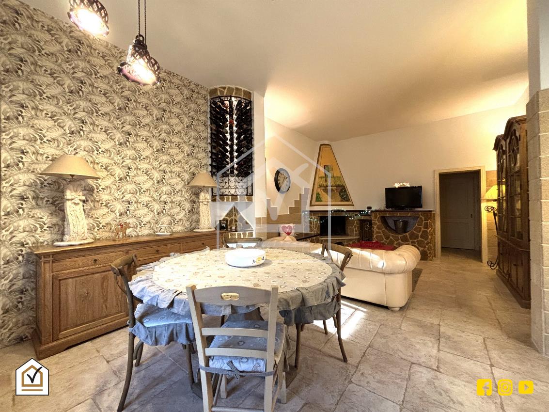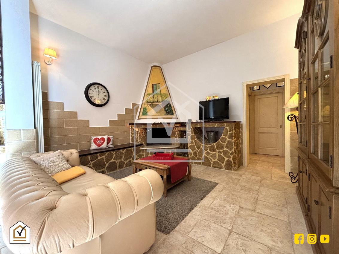 L’ingresso conduce in un luminoso salone con caminetto e angolo cottura, dove la pavimentazione in gres effetto chianca dona calore e carattere all’ambiente. La zona giorno è completata da un bagno con box e da un pratico ripostiglio.