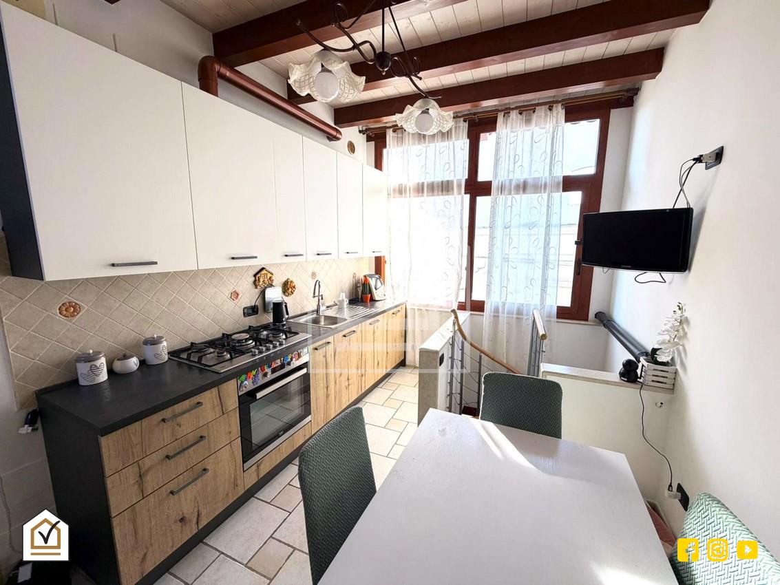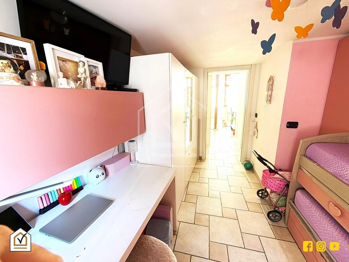 Salendo le scale a chiocciola, si accede al piano superiore dove sono presenti la cucina con ampia vetrata, una cameretta e un secondo bagno, tutti spazi funzionali e ben illuminati, ideali per conciliare praticità e comfort quotidiano.