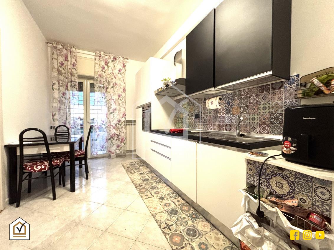 Alla sinistra del disimpegno troviamo la cucina abitabile, spaziosa e ben organizzata, con possibilità di ospitare comodamente il tavolo da pranzo; anche la cucina dispone di accesso diretto al balcone, rendendo l’ambiente particolarmente arioso e luminoso.