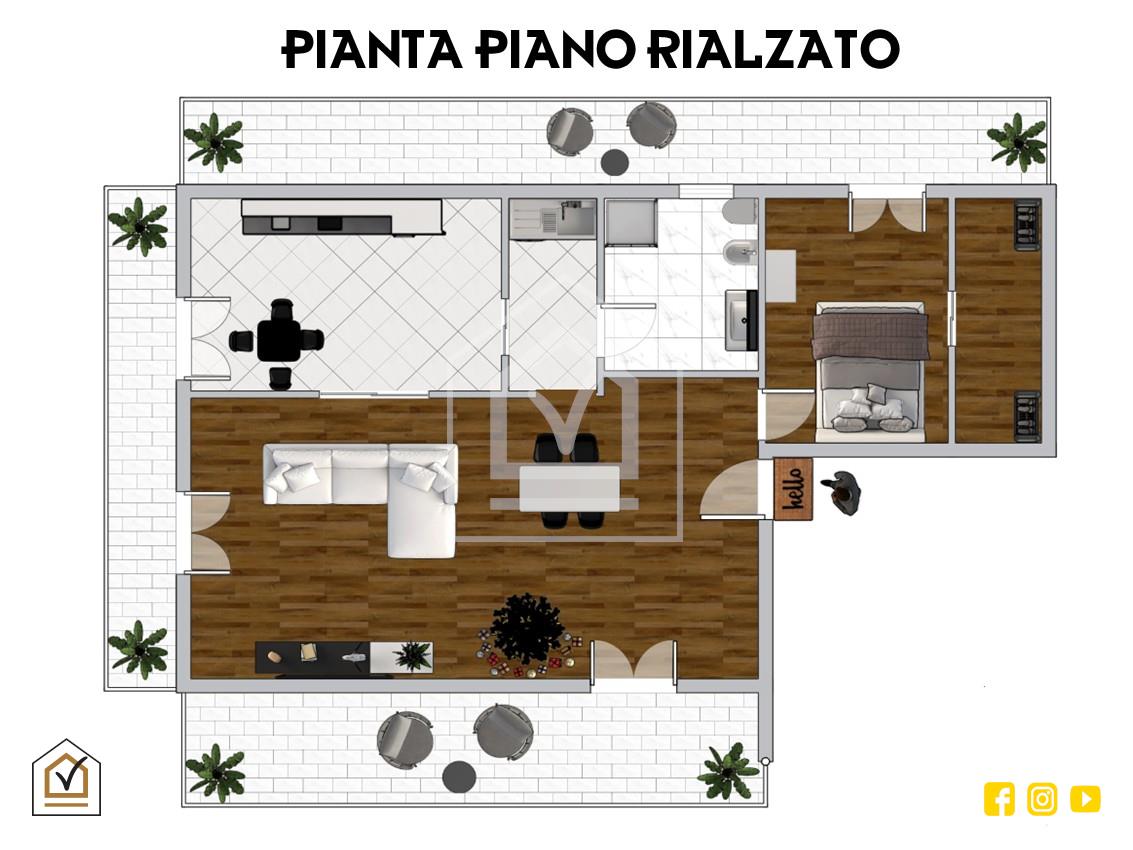L’accesso all’immobile avviene tramite ingresso privato, che introduce al piano rialzato direttamente in un ampio e luminoso salone, ambiente centrale della casa, caratterizzato da ottime proporzioni e da due porte finestra con uscite sui rispettivi balconi.