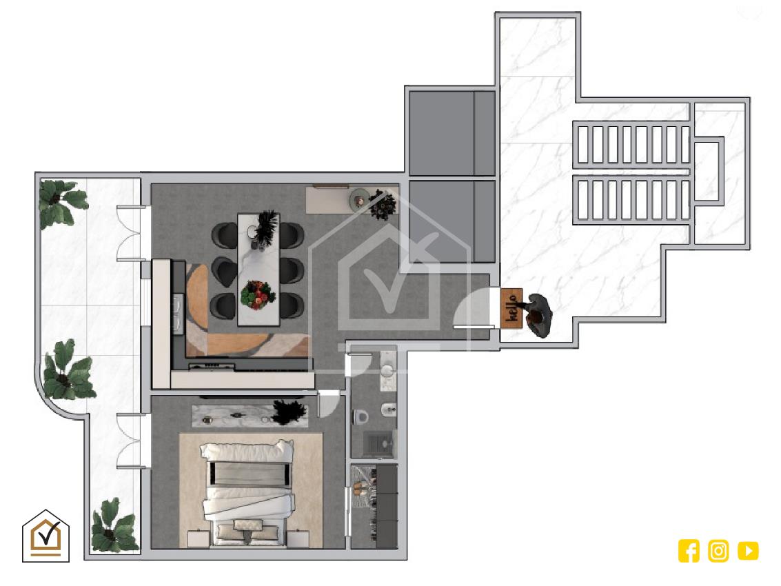 L’ingresso dell’abitazione si apre su un luminoso soggiorno con cucina angolare, funzionale e ben organizzata. La cucina è dotata di una porta finestra e una finestra laterale, che garantiscono un’ottima luminosità naturale e conducono al balcone terrazzato di circa 12 mq, ideale per momenti di relax e come naturale estensione della zona giorno.