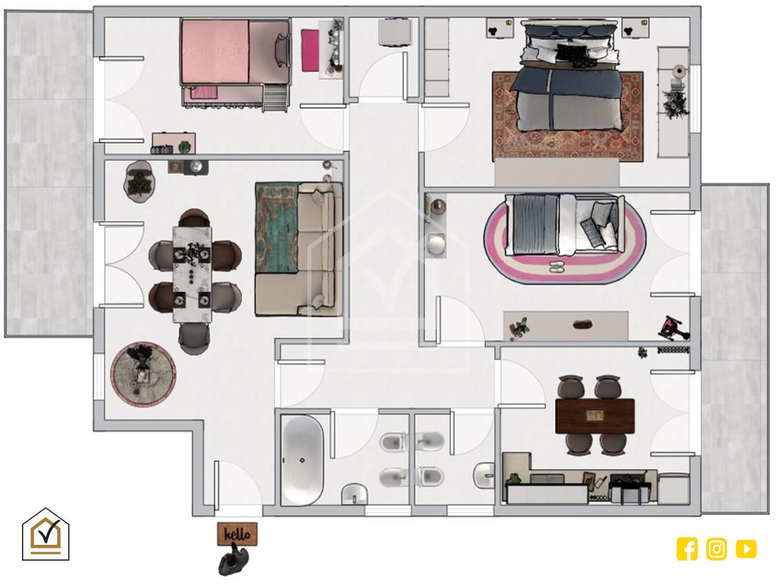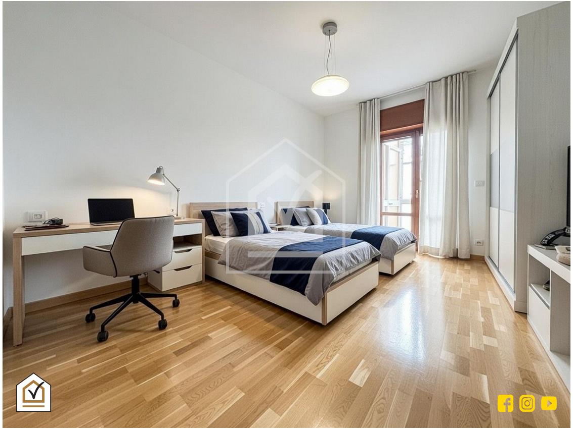 La zona notte, ben disimpegnata, offre tre spaziose camere da letto, tutte con accesso al balcone, pensate per garantire comfort, privacy e continuità di luce naturale durante tutta la giornata. I due bagni, entrambi finestrati, completano la casa assicurando praticità e funzionalità nella vita quotidiana.