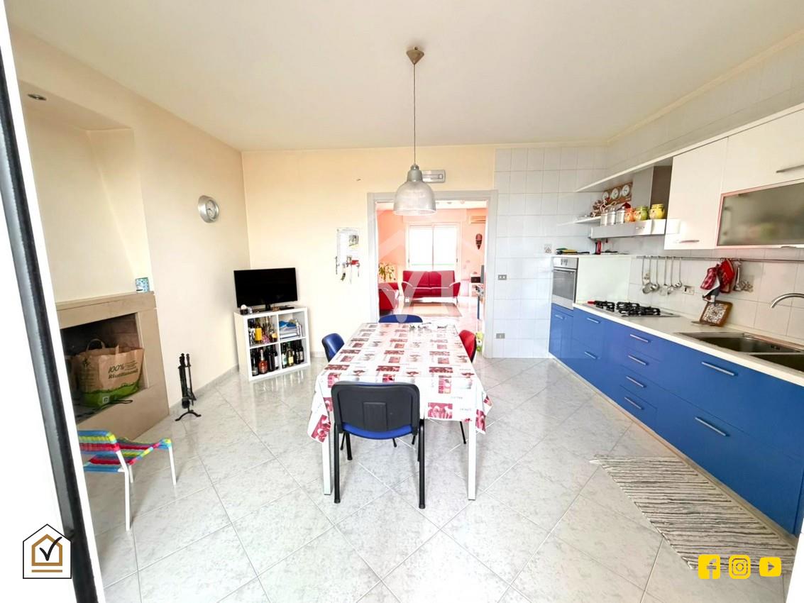 La cucina, spaziosa e funzionale, è dotata di un camino che valorizza l’ambiente e crea un’atmosfera calda e conviviale. Dalla cucina si accede al secondo balcone, dove trovano spazio un ripostiglio e un vano tecnico, soluzioni pratiche per organizzare al meglio la casa e mantenerla ordinata.