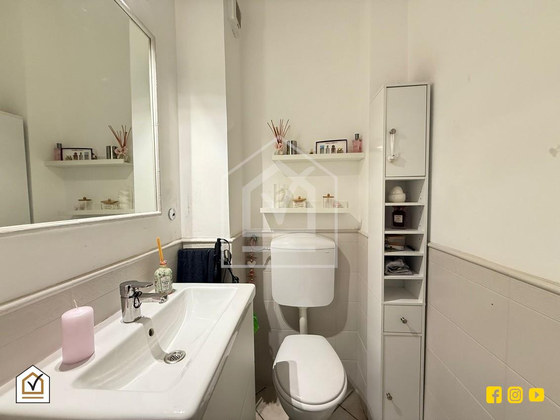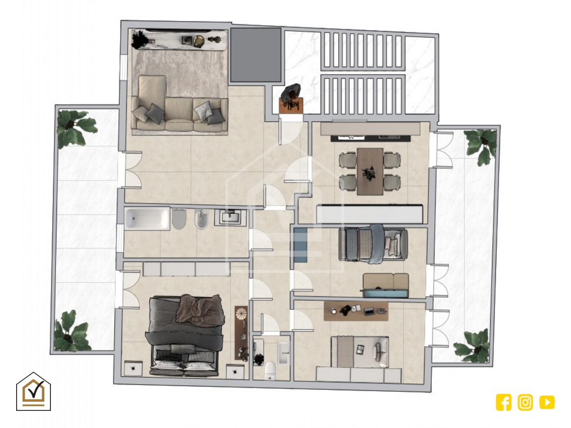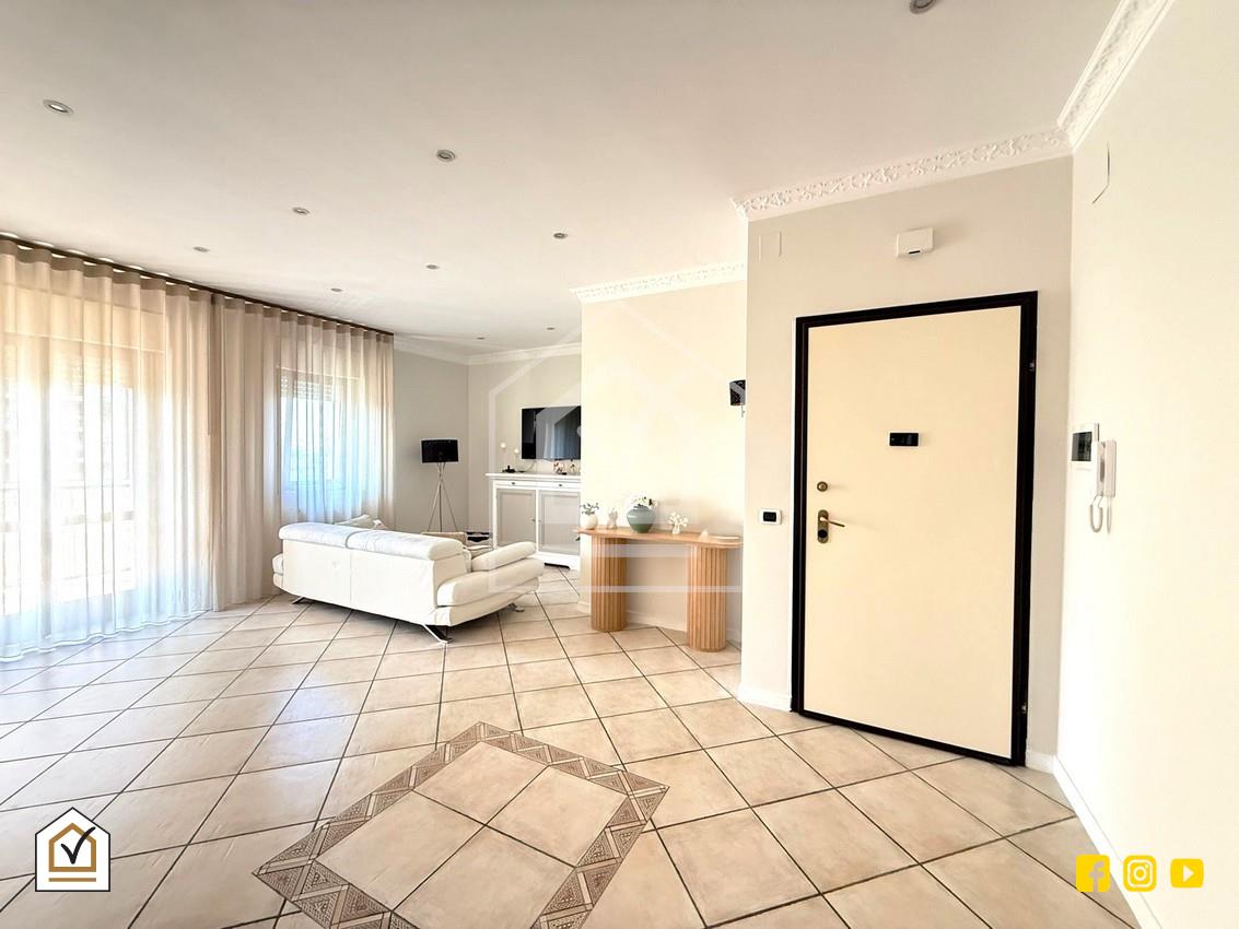 Varcando la soglia d’ingresso si viene accolti da un ampio e luminosissimo salone a vista, vero punto focale della casa, valorizzato da una porta finestra e una finestra che conducono direttamente al balcone. La doppia esposizione garantisce una straordinaria luminosità naturale durante tutto l’arco della giornata, rendendo ogni ambiente arioso e accogliente.