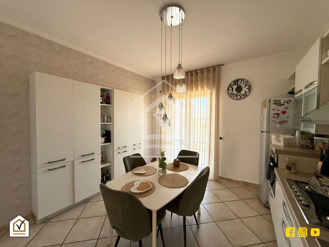 Sulla sinistra si sviluppa la cucina abitabile, comoda e funzionale, anch’essa dotata di porta finestra con accesso diretto al balcone, ideale per chi desidera vivere la zona giorno in maniera pratica e conviviale.