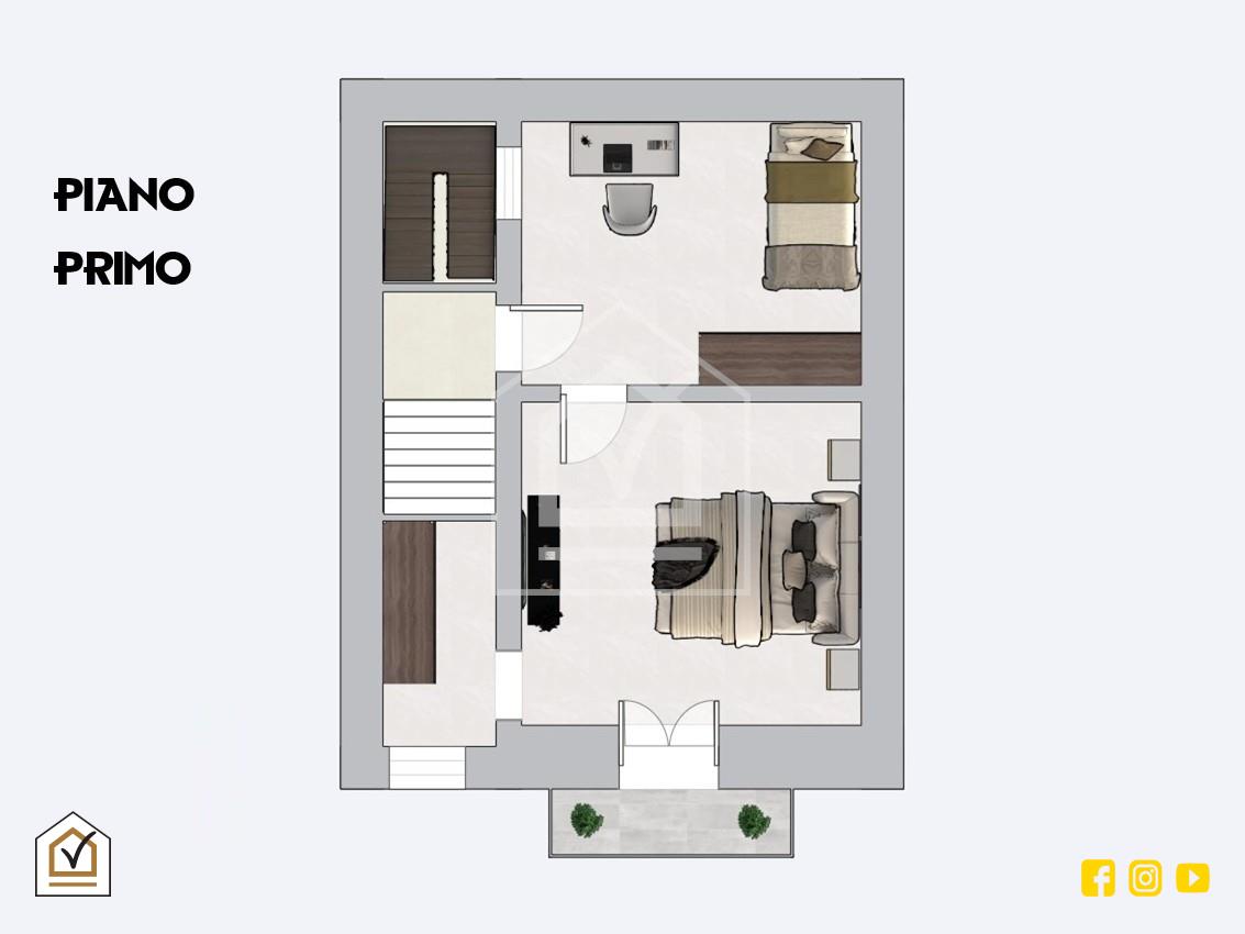L’accesso al primo piano è duplice: sia tramite un ingresso indipendente dalla strada, sia attraverso una scala interna collegata al salone. Qui si sviluppa la zona notte, composta da due camere ben distribuite, perfette per una spaziosa camera matrimoniale con cabina armadio e una cameretta.