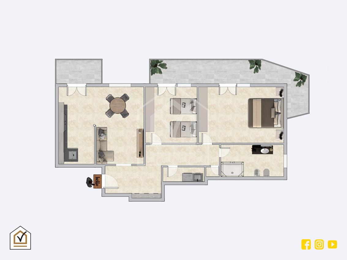L’ingresso introduce armoniosamente alla zona giorno, sviluppata sulla sinistra in un ampio ambiente unico, pensato per garantire convivialità e comfort abitativo, con spazi ben distribuiti e facilmente personalizzabili. La disposizione interna prosegue attraverso un funzionale disimpegno che accompagna alla zona notte, composta da due camere da letto di generosa metratura, un bagno e un pratico ripostiglio, elementi che rendono l’immobile particolarmente adatto a soddisfare le esigenze di una famiglia o di chi desidera ambienti ben organizzati.