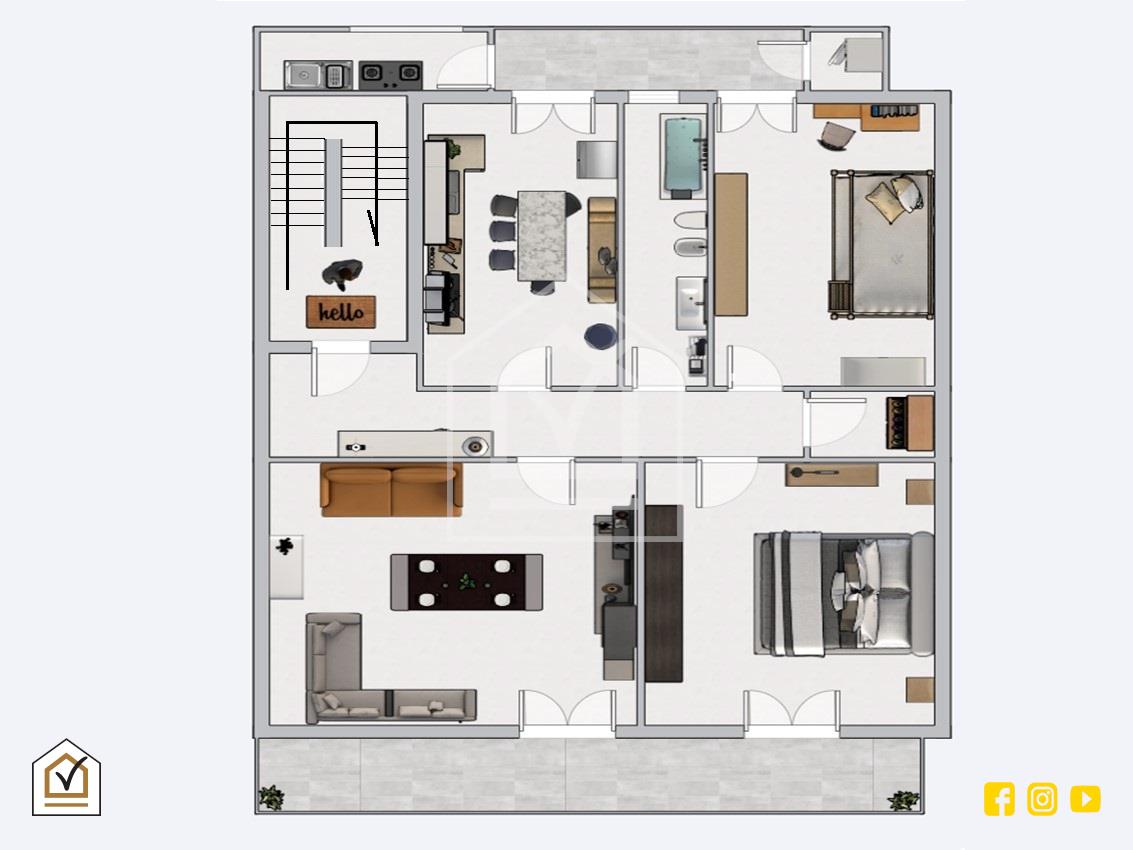 L’immobile, luminoso e ben distribuito, offre un grande salone, cucina con cucinino, due comode camere da letto, bagno e pratico ripostiglio, garantendo spazi ideali per ogni esigenza abitativa.