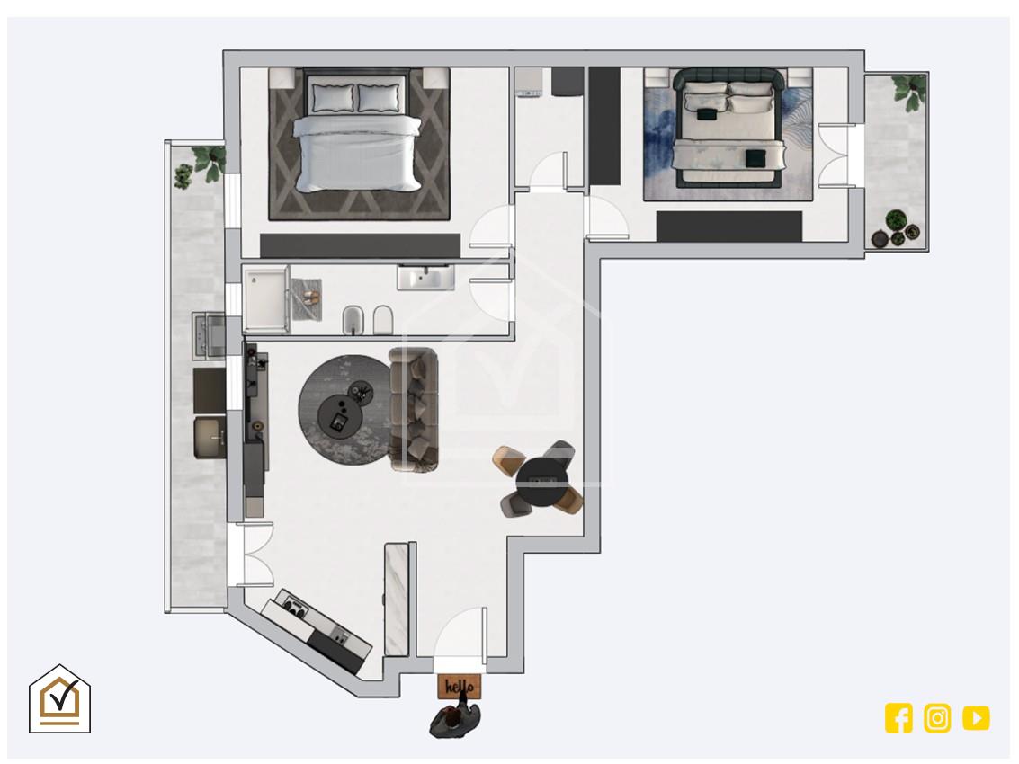 Varcata la soglia di ingresso si viene subito accolti da un’ampia e ariosa zona living che fonde armoniosamente la cucina e il soggiorno. Questo ambiente è ulteriormente impreziosito da una comoda veranda regolarmente condonata che amplia la superficie vivibile e regala un pratico sfogo aggiuntivo. Proseguendo lungo il corridoio si accede alla zona notte, organizzata in modo ottimale per garantire privacy e comfort. Sul lato sinistro si trova un pratico bagno finestrato, mentre lateralmente si aprono le due spaziose camere da letto matrimoniali, caratterizzate da un affaccio finestrato da un lato e da un balcone privato dall'altro. A completare la proprietà, proprio al centro del corridoio, è presente un utilissimo ripostiglio, ideale per organizzare al meglio la gestione quotidiana della casa.