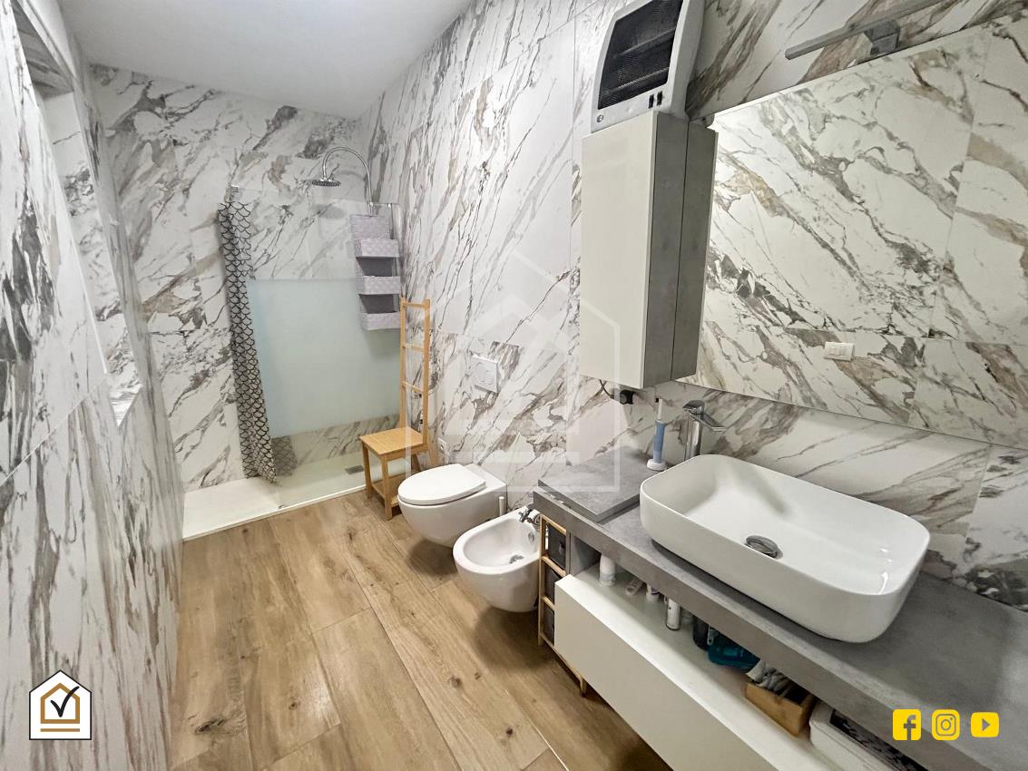Proseguendo lungo il disimpegno si raggiunge la camera matrimoniale, una vera oasi di riservatezza che vanta l'accesso a un secondo atrio interno, perfetto per godere di momenti di relax all'aria aperta in totale privacy. A completare questa raffinata superficie di 60 mq troviamo il bagno padronale, un ambiente grande e dotato di luce naturale grazie alla finestra con esposizione sull'atrio interno. Le finiture sono di altissimo livello, con un mobile lavabo e sanitari sospesi che esaltano la pulizia delle linee, una moderna doccia walk-in con vetro in cristallo e un elegante rivestimento delle pareti in grès effetto marmo che conferisce all'intera stanza un'atmosfera di lusso contemporaneo.