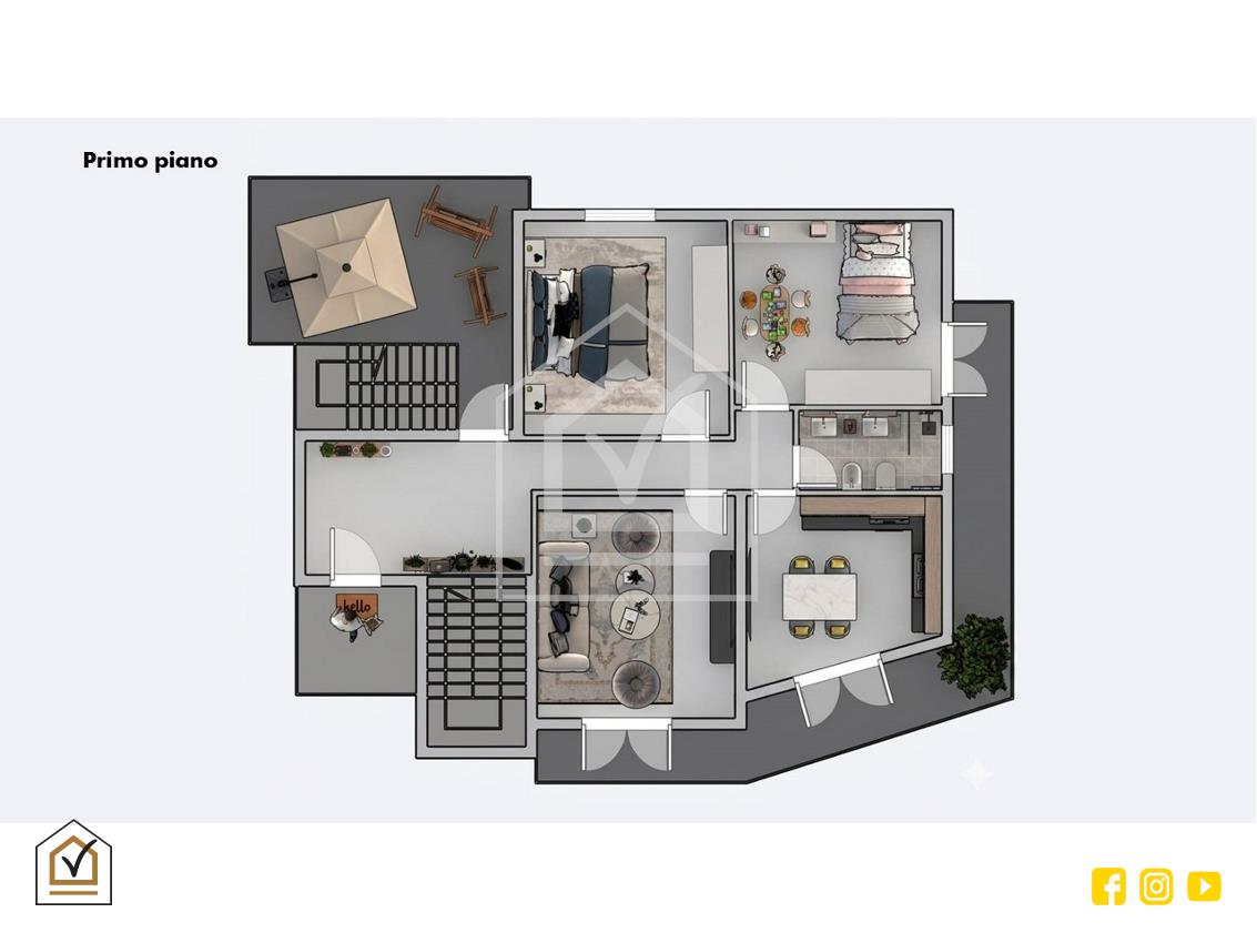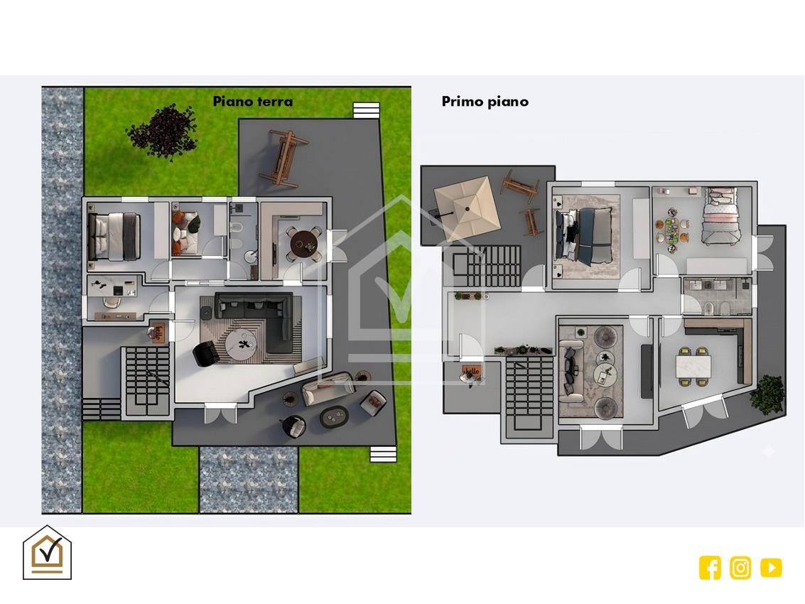 Il primo appartamento, situato al piano terra, si sviluppa su 130 mq interni ed è così composto: varcato l’ingresso, si viene accolti da un’ampia zona living illuminata da due finestre con esposizione angolare, di cui una consente l’accesso alla veranda che abbraccia la zona giorno. Segue una cucina abitabile con ulteriore accesso all’esterno. Completa l’immobile la zona notte, composta da due camere da letto, di cui una matrimoniale, entrambe dotate di finestre, un luminoso bagno con box doccia e uno studio.