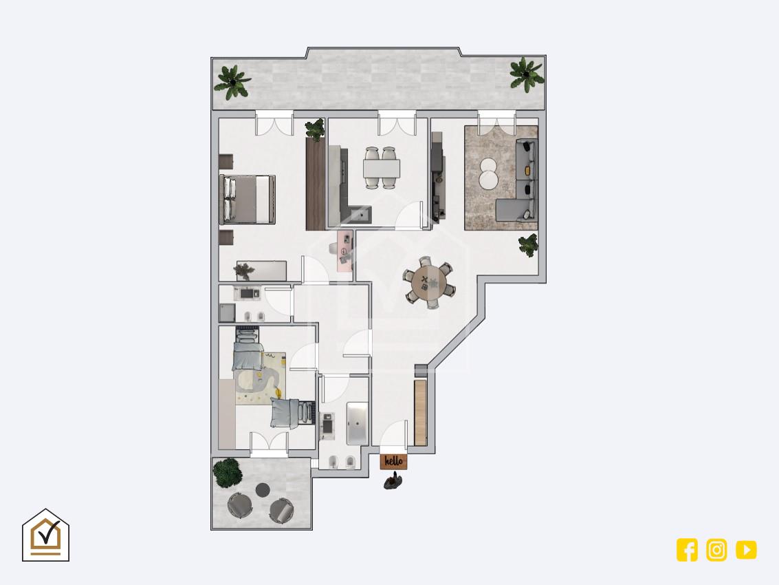 Esteso su una superficie di 120 mq circa, l'immobile è fornito di doppia esposizione e doppi servizi ed è così disposto: ingresso nell' ampio salone adiacente alla cucina abitabile, a seguire abbiamo il disimpegno che conduce alla zona notte composta da due spaziose camere da letto di cui una con balcone, al bagno di servizio e al bagno padronale entrambi finestrati.