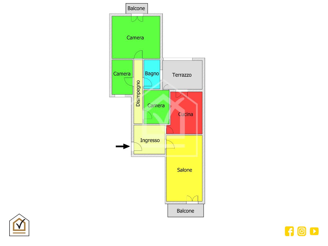 Ad accoglierci un arioso disimpegno con due spaziose camere adiacenti, favoriscono la realizzazione di un moderno OPEN-SPACE, il quale rendebbe l'immobile più esteso ed attuale. Completano la soluzione la cucina abitabile con esposizione interna, due camere di cui una matrimoniale e il bagno con vasca.