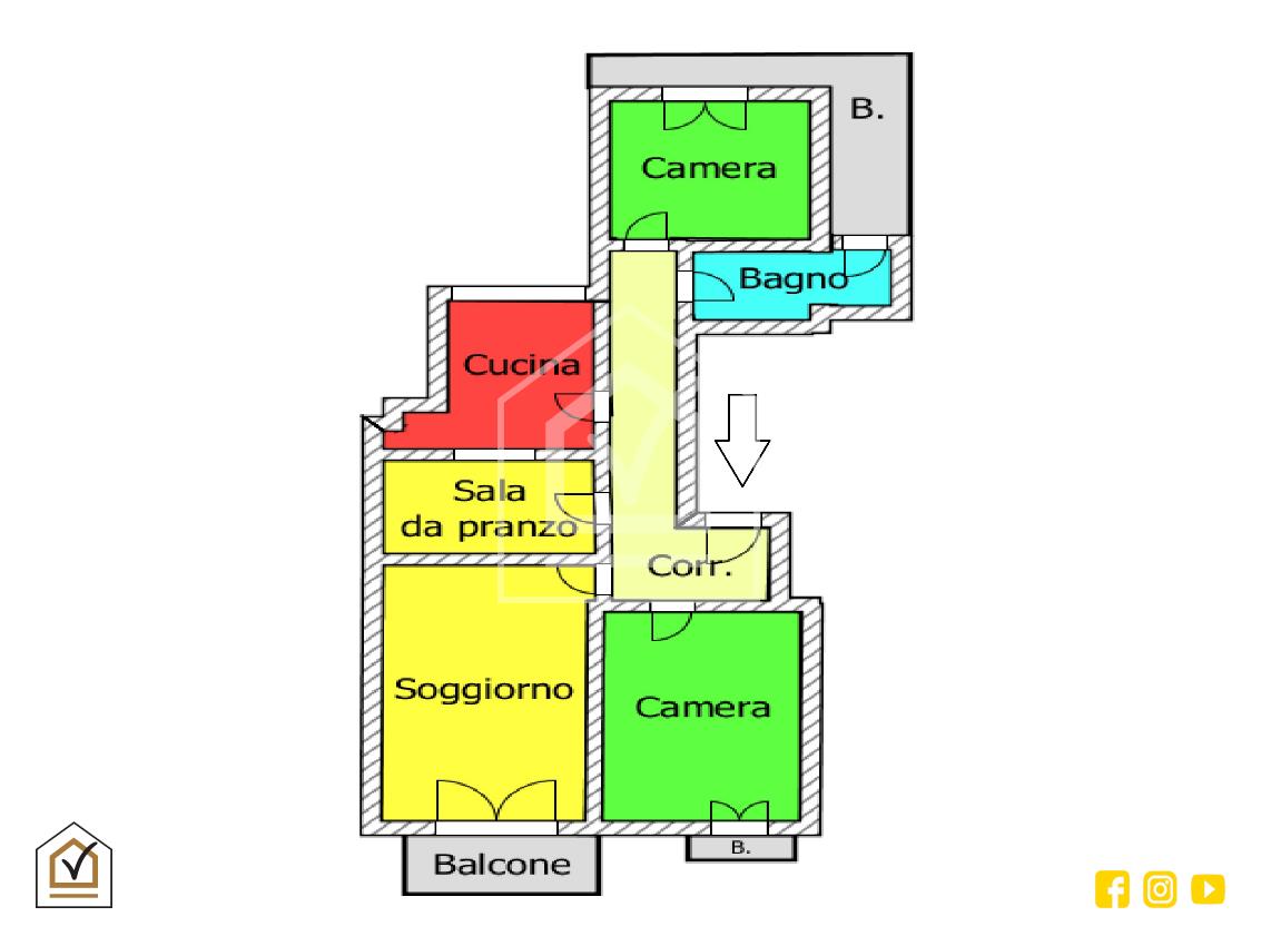 Al nostro ingresso veniamo accolti da un disimpegno dove troviamo una prima camera da letto con balcone alla romana con affaccio lato strada, proseguendo troviamo un ampio e luminoso soggiorno dotato di un comodo balcone, succesivamente veniamo accolti da una sala da pranzo confinante con la cucina. A completare la soluzione troviamo una seconda camera da letto con affaccio sul balcone interno angolare e bagno.