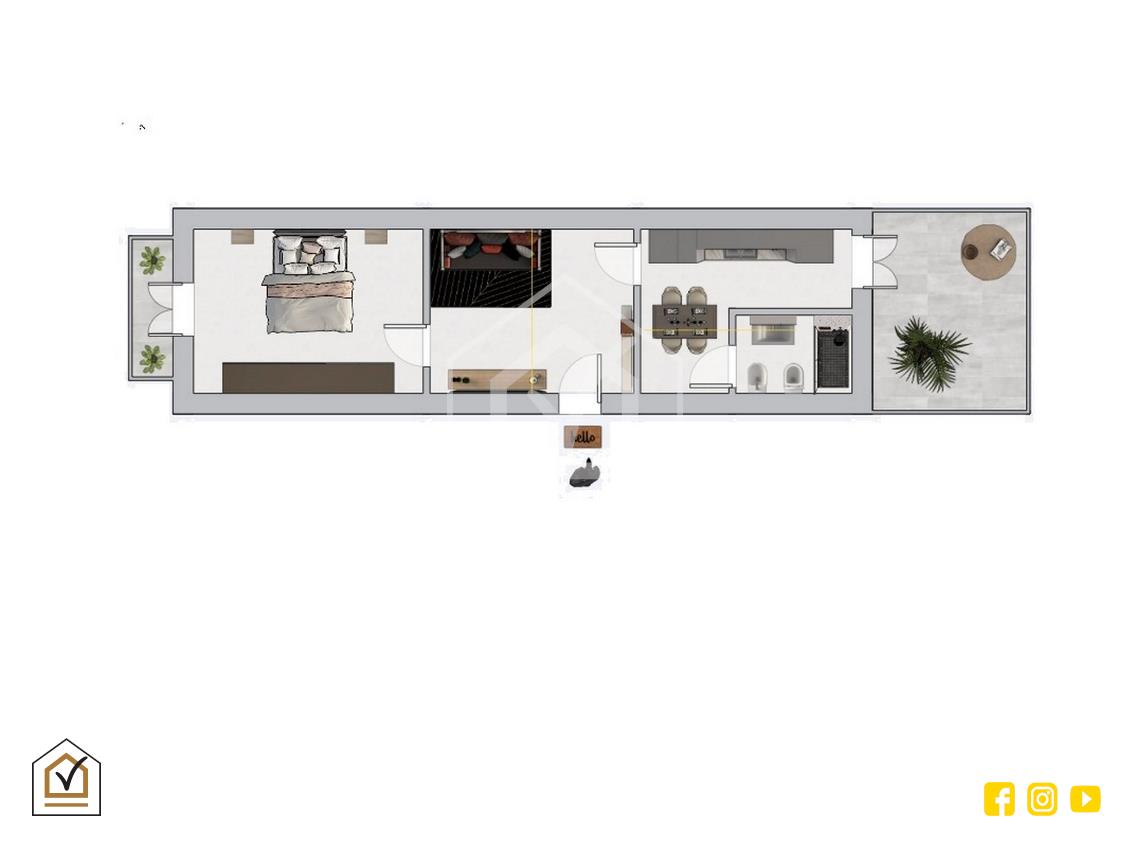 L’appartamento si apre su un ampio ingresso che conduce direttamente al salone, perfetto per creare un ambiente armonioso e funzionale. Accanto al salone, si trova la cucina, un ambiente ben strutturato e pratico, con una finestra che si affaccia direttamente sul terrazzo. Questo collegamento tra la zona giorno e l’esterno rende la cucina ancora più luminosa e vivibile, creando una continuità tra l'interno e il bello dell'ambiente circostante. L'ampia camera da letto di questo appartamento offre ampio spazio per arredarla secondo i propri gusti, con la possibilità di inserire un grande letto matrimoniale, armadi e comodini.