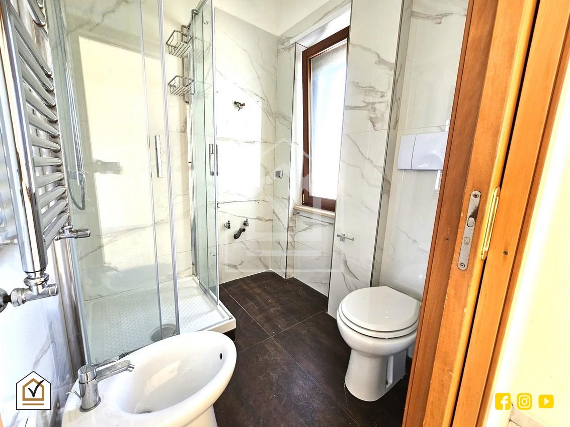 - Bagno di servizio con sanitari a pavimento e box doccia con rivestimento in gress effetto marmo;