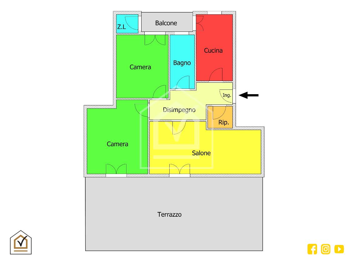 Internamente un breve corridoio fornisce l'accesso a tutte le stanze tra le quali troviamo: il luminoso salone e la camera adiacente con l'esposizione esterna terrazzata mentre la cucina abitabile e la seconda camera da letto sono accomunate dall'esposizione interna con balcone completo di uno stanzino utile per realizzare una zona lavanderia. Il tutto si completa con il bagno con vasca e l'utile ripostiglio interno.