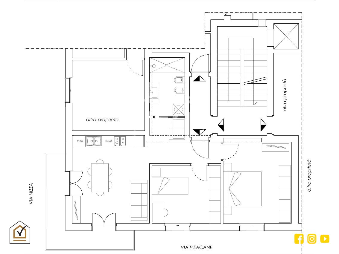 Al nostro ingresso, un disimpegno arricchito da un ribasso in cartongesso ci conduce nelle due accoglienti camere da letto entrambe con affaccio su Via Pisacane; proseguendo abbiamo accesso ad una confortevole e luminosa zona open-space dotata di balcone con affaccio angolare ed infine troviamo un comodissimo ripostiglio presente nell'antibagno ed il bagno con sanitari sospesi effetto ceramica marca Vitra round o simile, rivestimento pareti effetto marmo, un termoarredo collegato all'impianto elettrico e una composizione doccia Jacuzzi Gun o simile con piatto doccia effetto pietra.