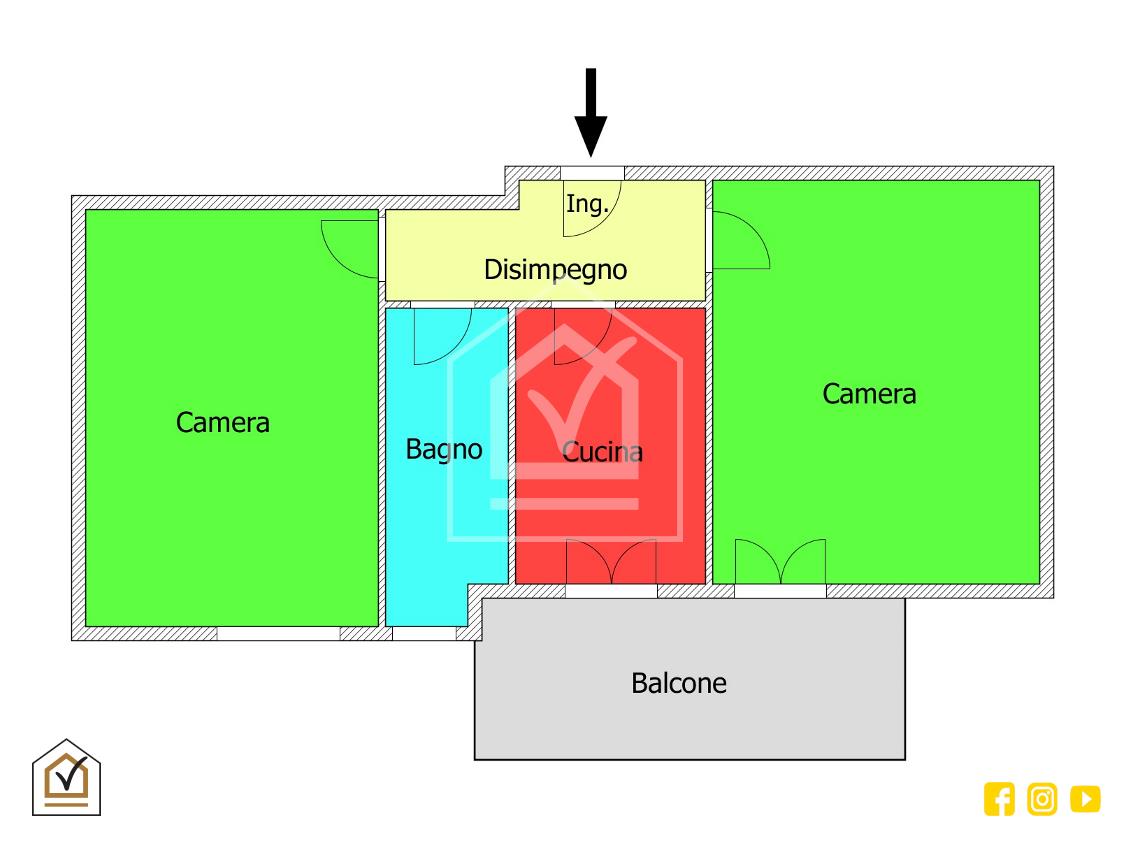 Attualmente possiede la seguente disposizione: ingresso in un breve disimpegno, cucina abitabile, due ampie camere da destinare in base alle esigenze personali e il bagno padronale con box doccia.