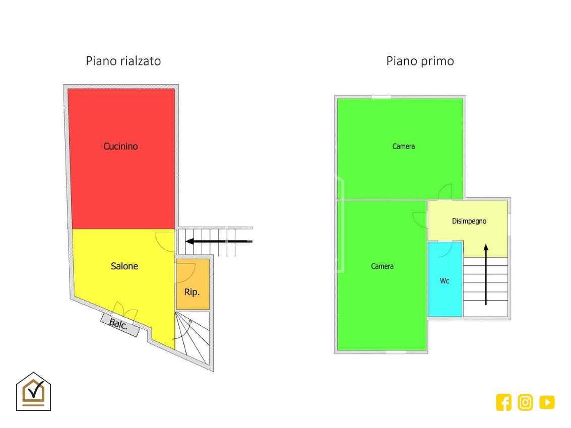 Da un portoncino privato alla strada, saliamo al piano rialzato, dove si sviluppa il salone di 20 mq con volte alte circa 3.5 metri ed una caratteristica pavimentazione in chianca, cucina ed un pratico ripostiglio ideale per creare una dispensa; dalla scala interna si accede al primo piano, dove un disimpegno ci conduce ad una spaziosa camera matrimoniale con affaccio e la camera seconda con bagno.