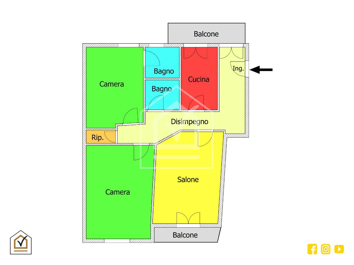 Si tratta di un appartamento con ingresso nel disimpegno che funge da collegamento a tutte le altre stanze, quali: ampio salone con adiacente cucinino esposti esternamente, due spaziose camere da letto, di cui la camera padronale con bagno privato ed un ulteriore secondo bagno con box doccia.