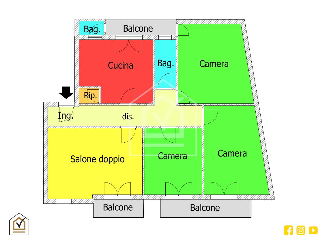 Varcando la porta d' ingresso si è subito accolti da un comodo ingresso che conduce alla zona giorno con doppio salone e cucina; proseguendo il disimpegno si giunge alla zona notte composta dalla camera matrimoniale, altre due camere da letto e bagno. Attualmente riversa in buono stato e tutti gli infissi sono stati sostituiti (anticorodal e vetrocamera) ma grazie alla sua pianta regolare è possibile, apportando alcune modifiche, ricreare un moderno open space!