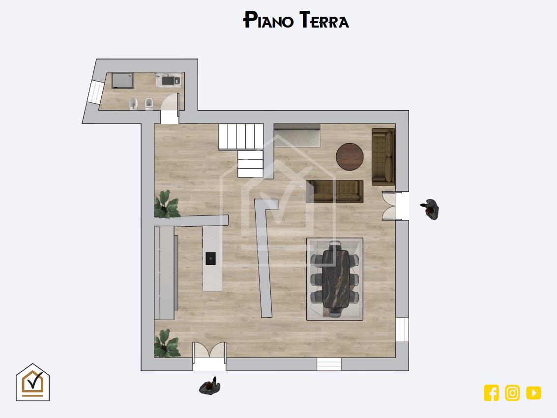 Varcando la porta d'ingresso blindata si è accolti dalla zona living composta da un ampio ed accogliente salone con adiacente la cucina; ogni stanza è dotata di uscita all'esterno, il che rende gli ambienti luminosi e ariosi in tutte le ore del giorno. Punto caratteristico sono le volte a botte interamente rivestite in pietra e tufo e la pavimentazione in gress effetto parquet dai colori caldi e impreziosita da faretti che ne donano continuità e omogeneità per tutta l'abitazione. La cucina presenta una penisola attrezzata completa di frigo e congelatore con piano di appoggio. Dal disimpegno si giunge al bagno e al vano lavanderia posto nel sottoscala; da quest'ultima si giunge al primo piano.
